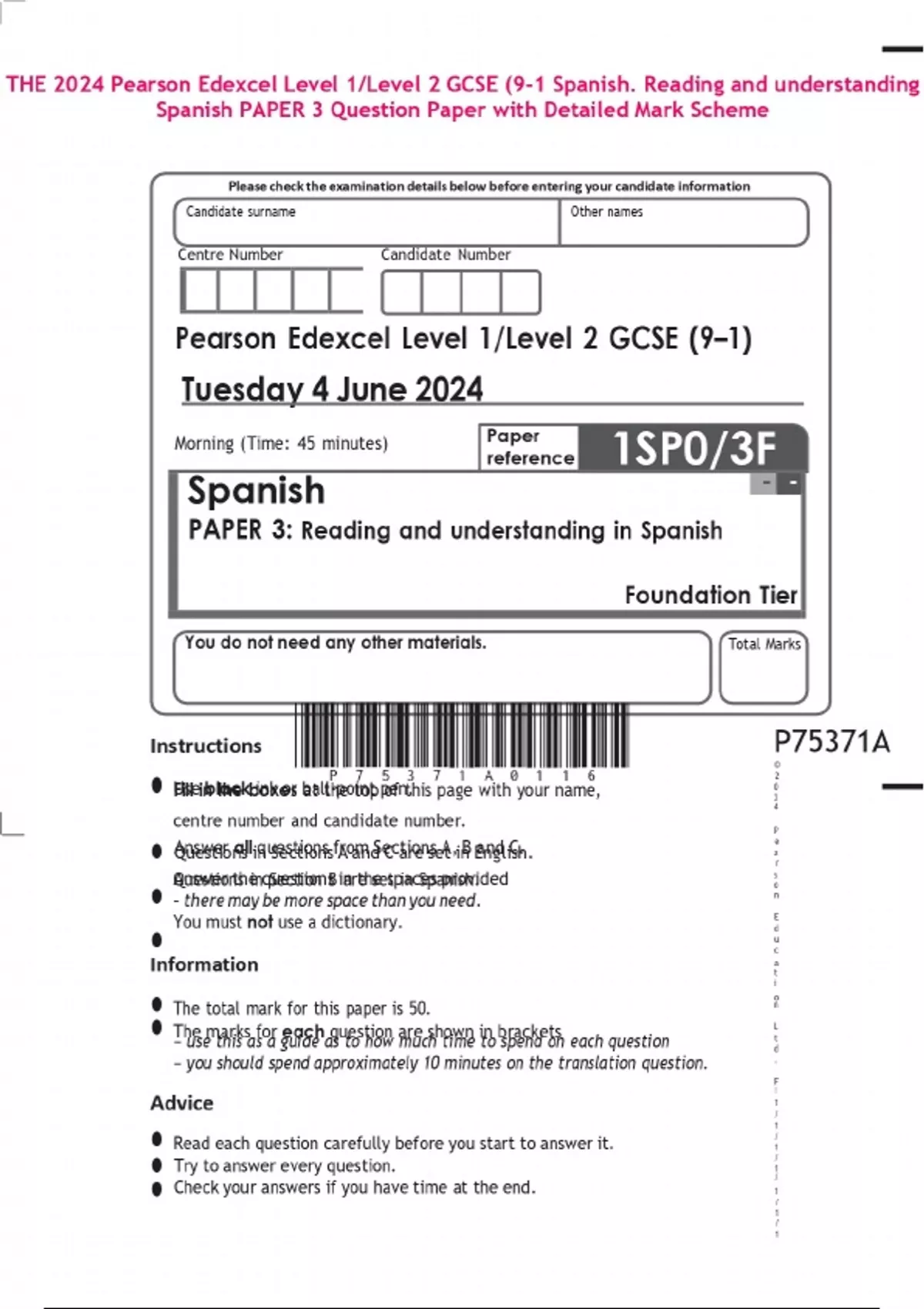 THE 2024 Pearson Edexcel Level 1/Level 2 GCSE (9-1 Spanish. Reading and understanding Spanish PAPER 3 Question Paper with Detailed Mark Scheme
