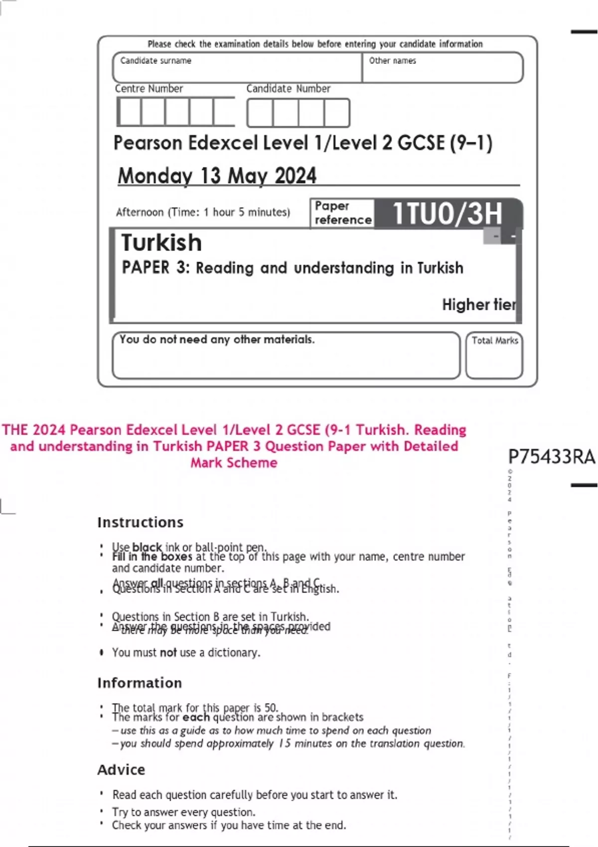 THE 2024 Pearson Edexcel Level 1/Level 2 GCSE (9-1 Turkish. Reading and understanding in Turkish PAPER 3 Question Paper with Detailed Mark Scheme