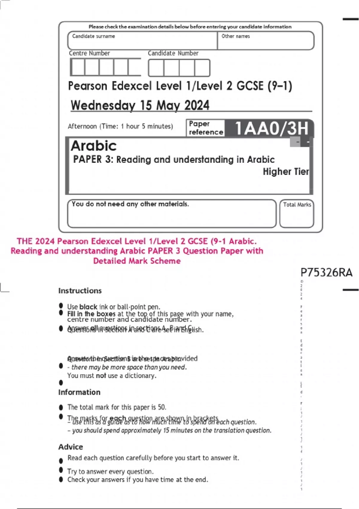 THE 2024 Pearson Edexcel Level 1/Level 2 GCSE (9-1 Arabic. Reading and understanding Arabic PAPER 3 Question Paper with Detailed Mark Scheme