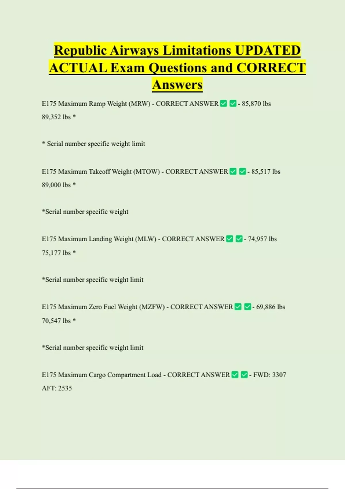 E175 Maximum Landing Weight (MLW) - CORRECT ANSWER - 74,957 lbs