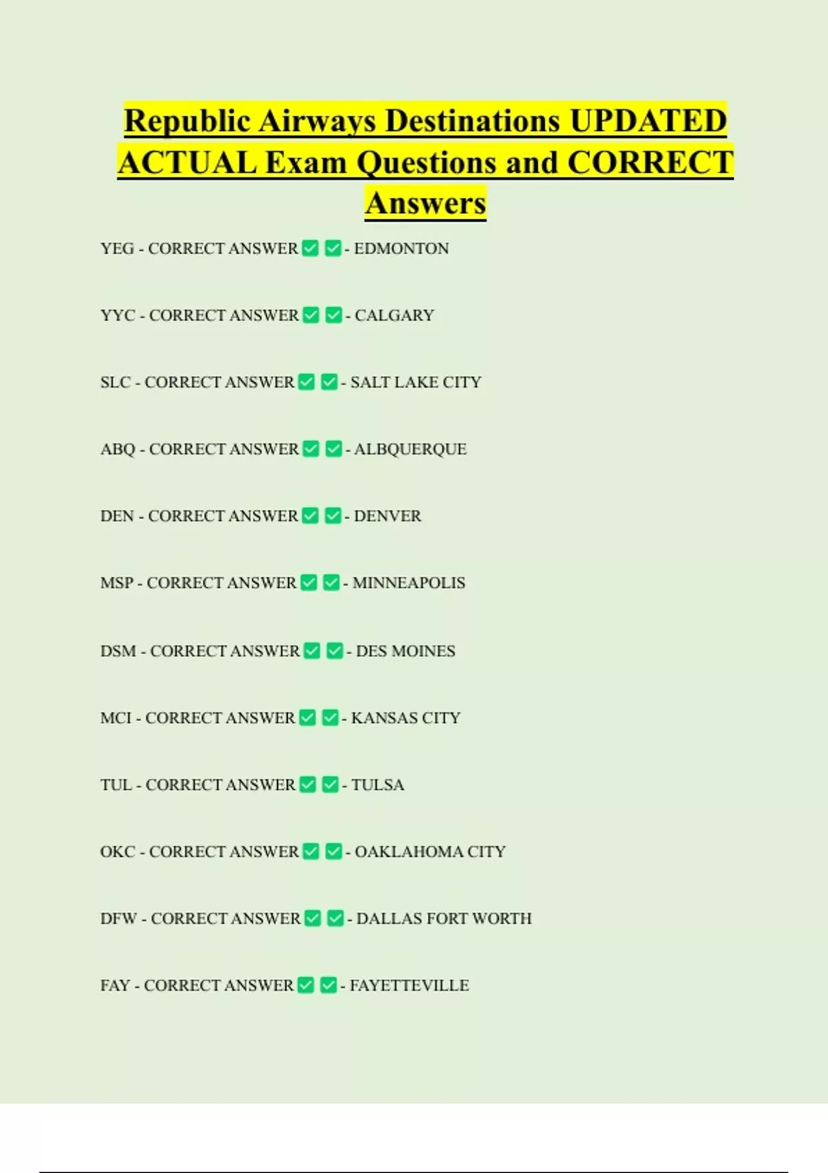 Republic Airways Destinations UPDATED ACTUAL Exam Questions and CORRECT Answers YEG - CORRECT ANSWER YYC - CORRECT ANSWER SLC - CORRECT ANSWER ABQ - CORRECT ANSWER DEN - CORRECT ANSWER MSP - CORRECT ANSWER DSM - CORRECT ANSWER MCI - CORRECT ANSWER TUL - CORRECT ANSWER OKC - CORRECT ANSWER DFW - CORRECT ANSWER FAY - CORRECT ANSWER - EDMONTON - CALGARY - SALT LAKE CITY