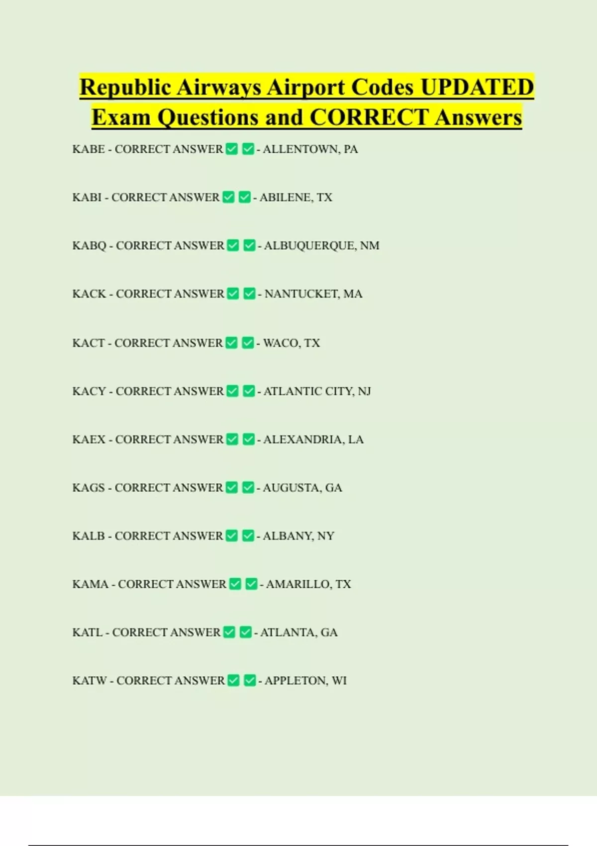 Republic Airways Airport Codes UPDATED Exam Questions and CORRECT Answers KABE - CORRECT ANSWER KABI - CORRECT ANSWER KABQ - CORRECT ANSWER KACK - CORRECT ANSWER KACT - CORRECT ANSWER KACY - CORRECT ANSWER KAEX - CORRECT ANSWER KAGS - CORRECT ANSWER KALB - CORRECT ANSWER KAMA - CORRECT ANSWER KATL - CORRECT ANSWER KATW - CORRECT ANSWER - ALLENTOWN, PA - ABILENE, TX - ALBUQUERQUE, NM - NANTUCKET, MA
