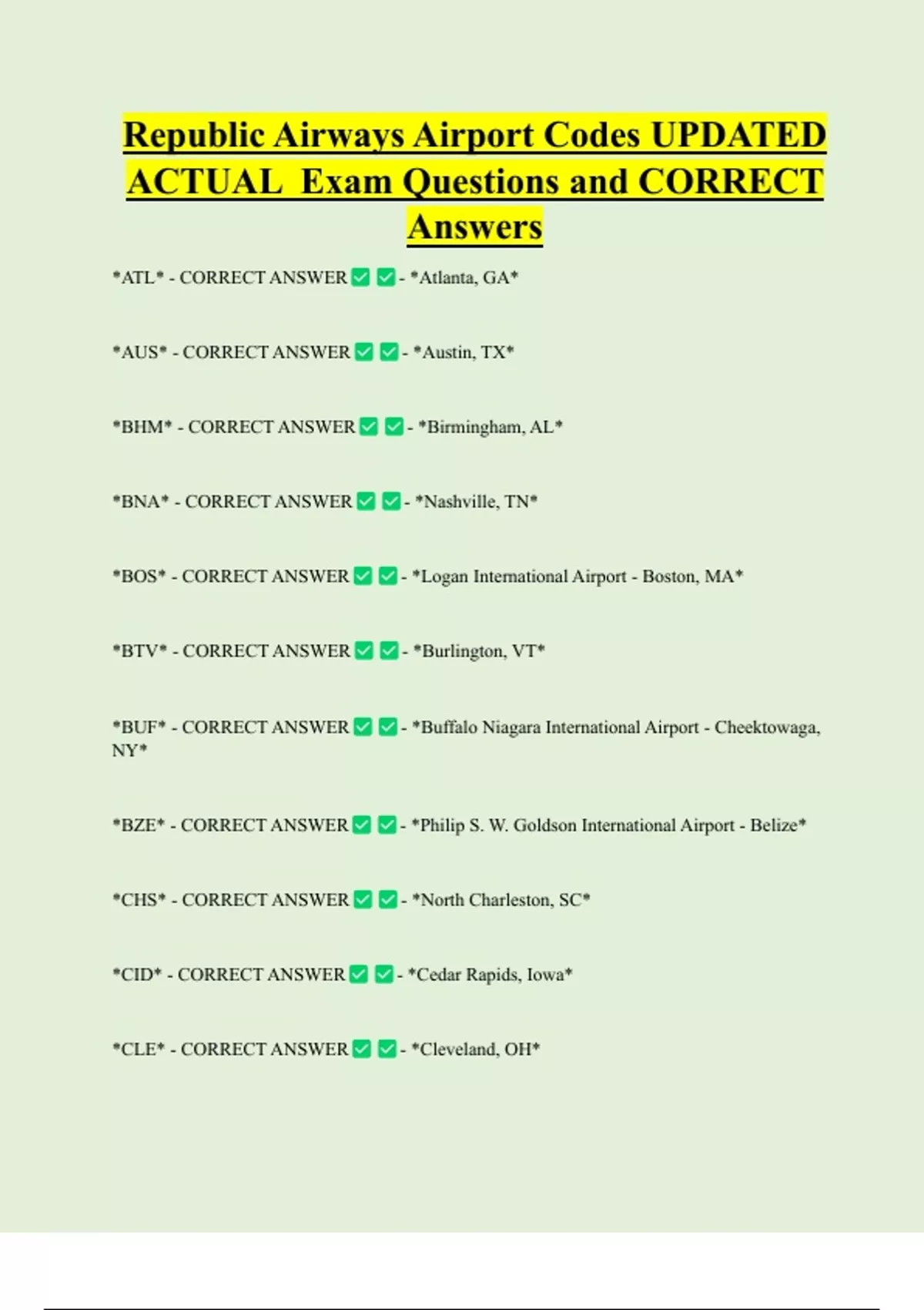 Republic Airways Airport Codes UPDATED ACTUAL Exam Questions and CORRECT Answers *ATL* - CORRECT ANSWER *AUS* - CORRECT ANSWER *BHM* - CORRECT ANSWER *BNA* - CORRECT ANSWER *BOS* - CORRECT ANSWER *BTV* - CORRECT ANSWER *BUF* - CORRECT ANSWER NY* *BZE* - CORRECT ANSWER *CHS* - CORRECT ANSWER *CID* - CORRECT ANSWER *CLE* - CORRECT ANSWER - *Atlanta, GA* - *Austin, TX* - *Birmingham, AL