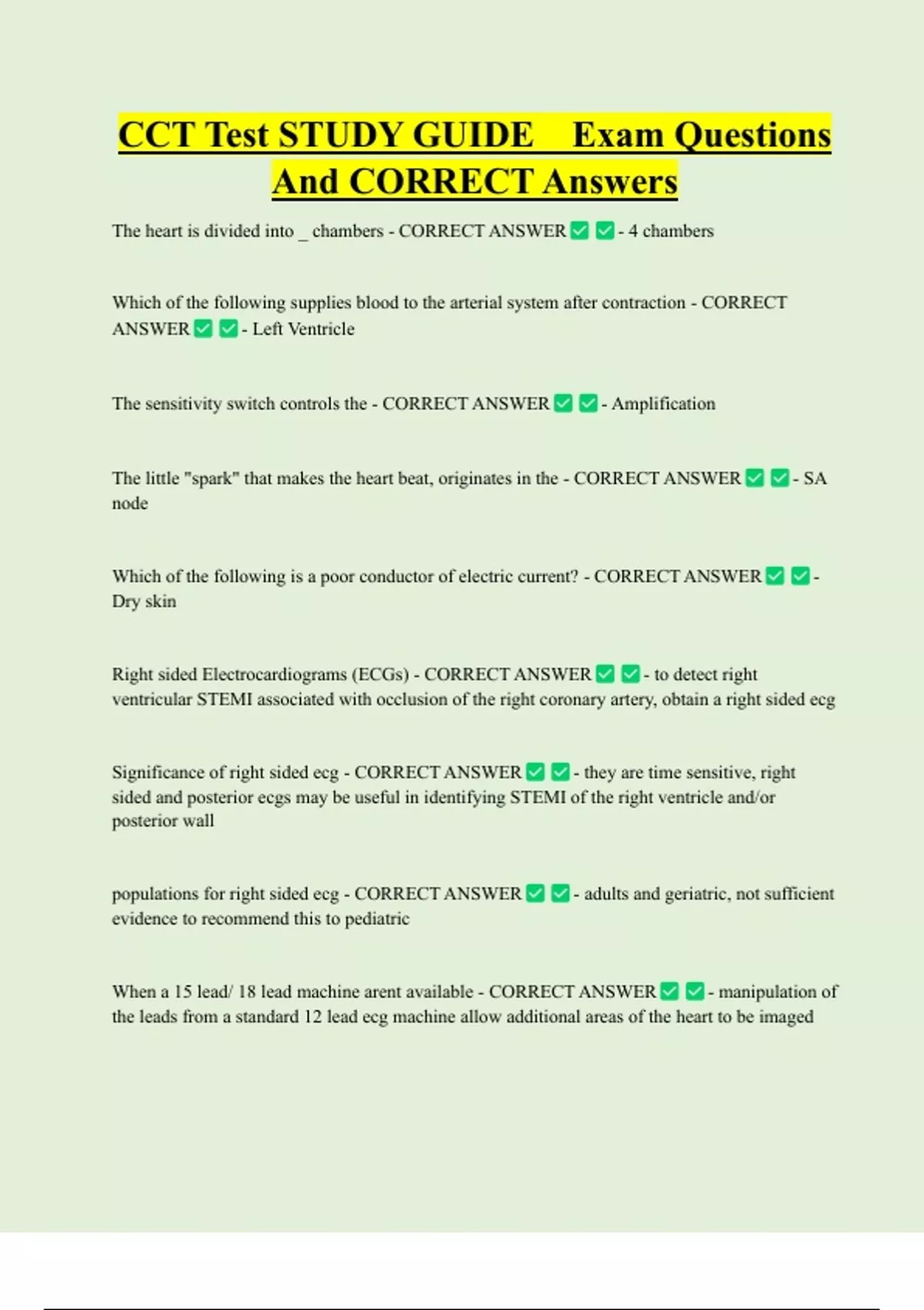 CCT Test STUDY GUIDE Exam Questions And CORRECT Answers The heart is divided into _ chambers - CORRECT ANSWER - 4 chambers Which of the following supplies blood to the arterial system after contraction - CORRECT ANSWER - Left Ventricle The sensitivity switch controls the - CORRECT ANSWER - Amplification The little "spark" that makes the heart beat, originates in the - CORRECT ANSWER node Which of the following is a poor conductor of electric current? - CORRECT ANSWER Dry skin Right sided Electrocardiograms (ECGs) - CORRECT ANSWER - SA