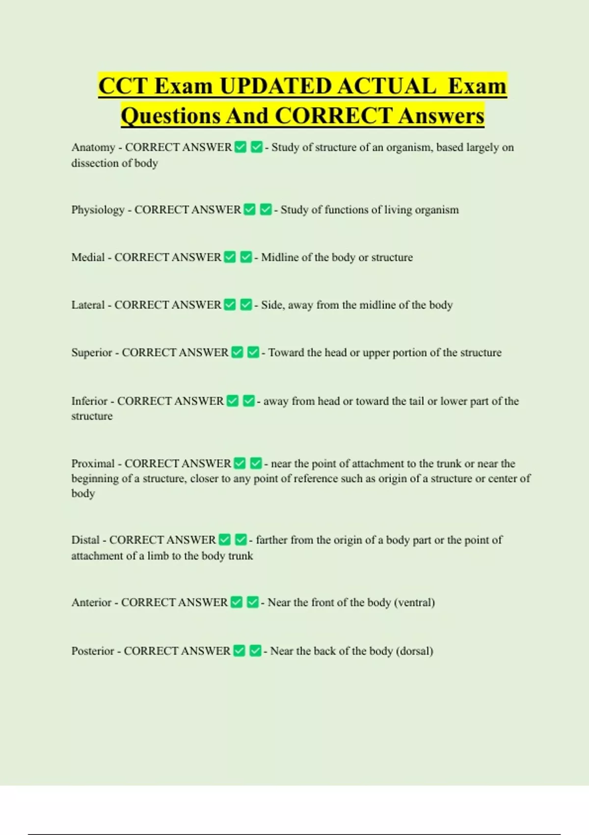 CCT Exam UPDATED ACTUAL Exam Questions And CORRECT Answers Anatomy - CORRECT ANSWER dissection of body Physiology - CORRECT ANSWER Medial - CORRECT ANSWER Lateral - CORRECT ANSWER Superior - CORRECT ANSWER Inferior - CORRECT ANSWER structure Proximal - CORRECT ANSWER - Study of structure of an organism, based largely on - Study of functions of living organism - Midline of the body or structure - Side, away from the midline of the body