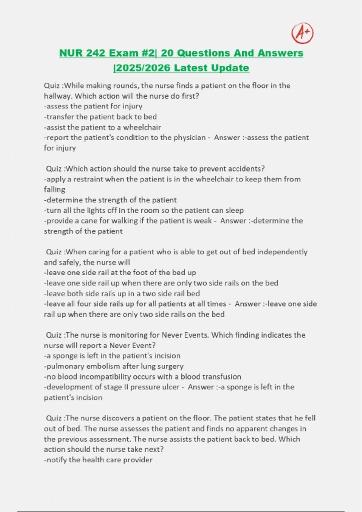 NUR 242 Exam #2| 20 Questions And Answers |2025/2026 Latest Update