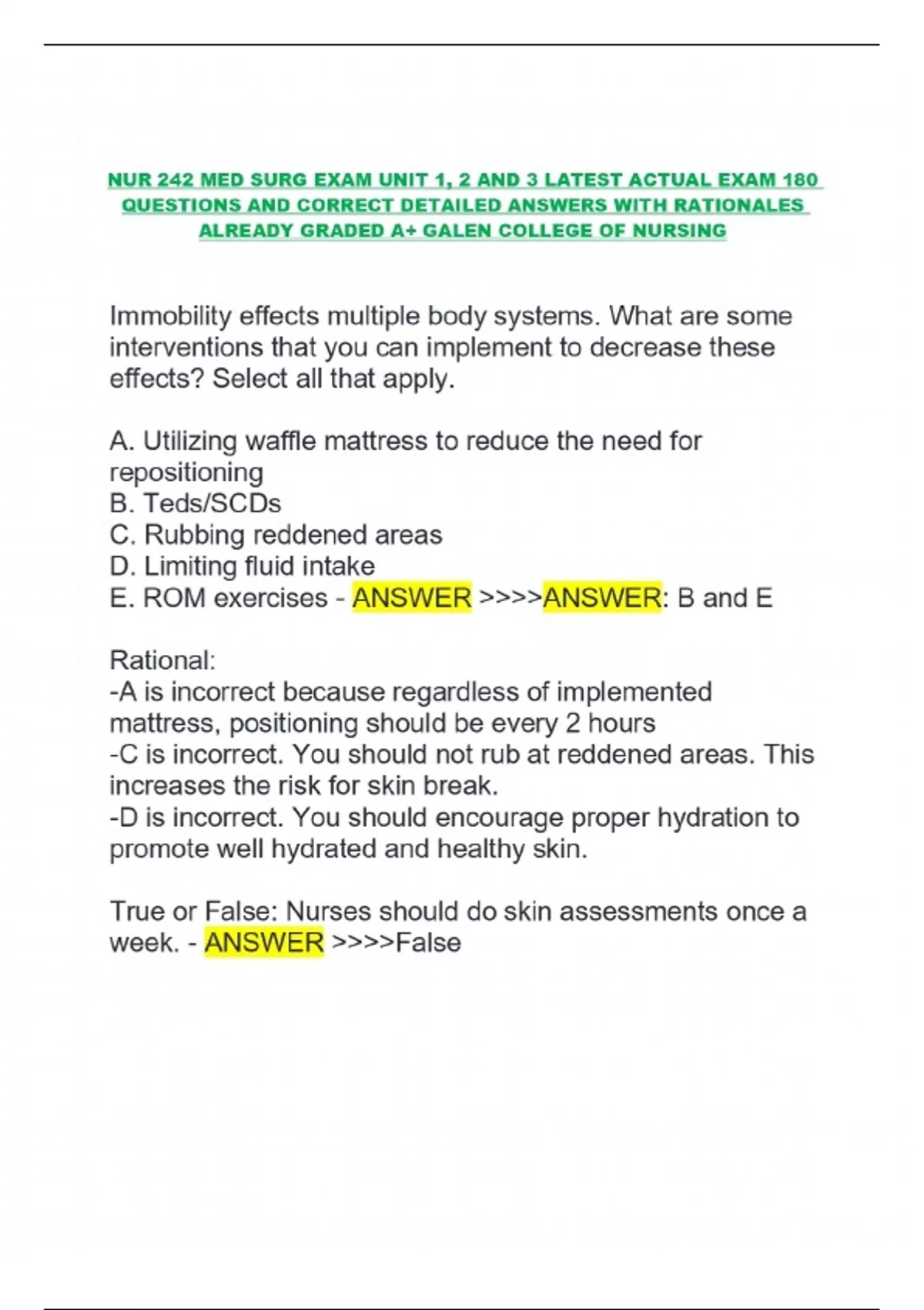 NUR 242 MED SURG EXAM UNIT 1, 2 AND 3 LATEST ACTUAL EXAM 180 QUESTIONS AND CORRECT DETAILED ANSWERS WITH RATIONALES ALREADY GRADED A+ GALEN COLLEGE OF NURSING