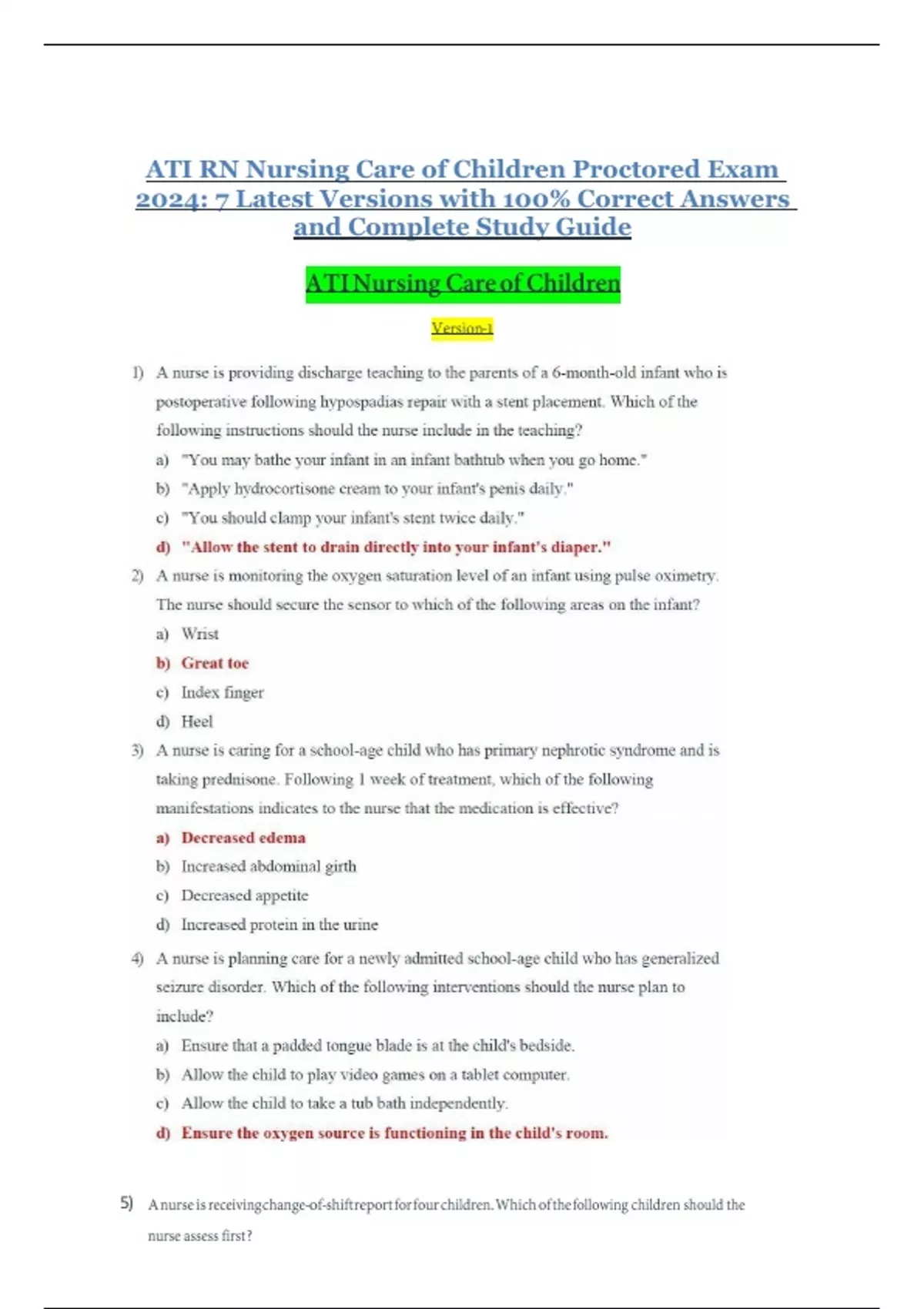 Prepare with confidence for the ATI RN Nursing Care of Children Proctored Exam 2024 with this comprehensive study guide featuring 7 latest exam versions. This resource includes realistic exam questions, 100% correct answers, and detailed rationales for each item, ensuring you’re fully prepared for the exam. Topics covered include pediatric assessment, growth and development, pediatric pharmacology, health promotion, disease prevention, and nursing interventions. Perfect for nursing students aiming to pass with flying colors, this complete study solution is your trusted tool for guaranteed success.