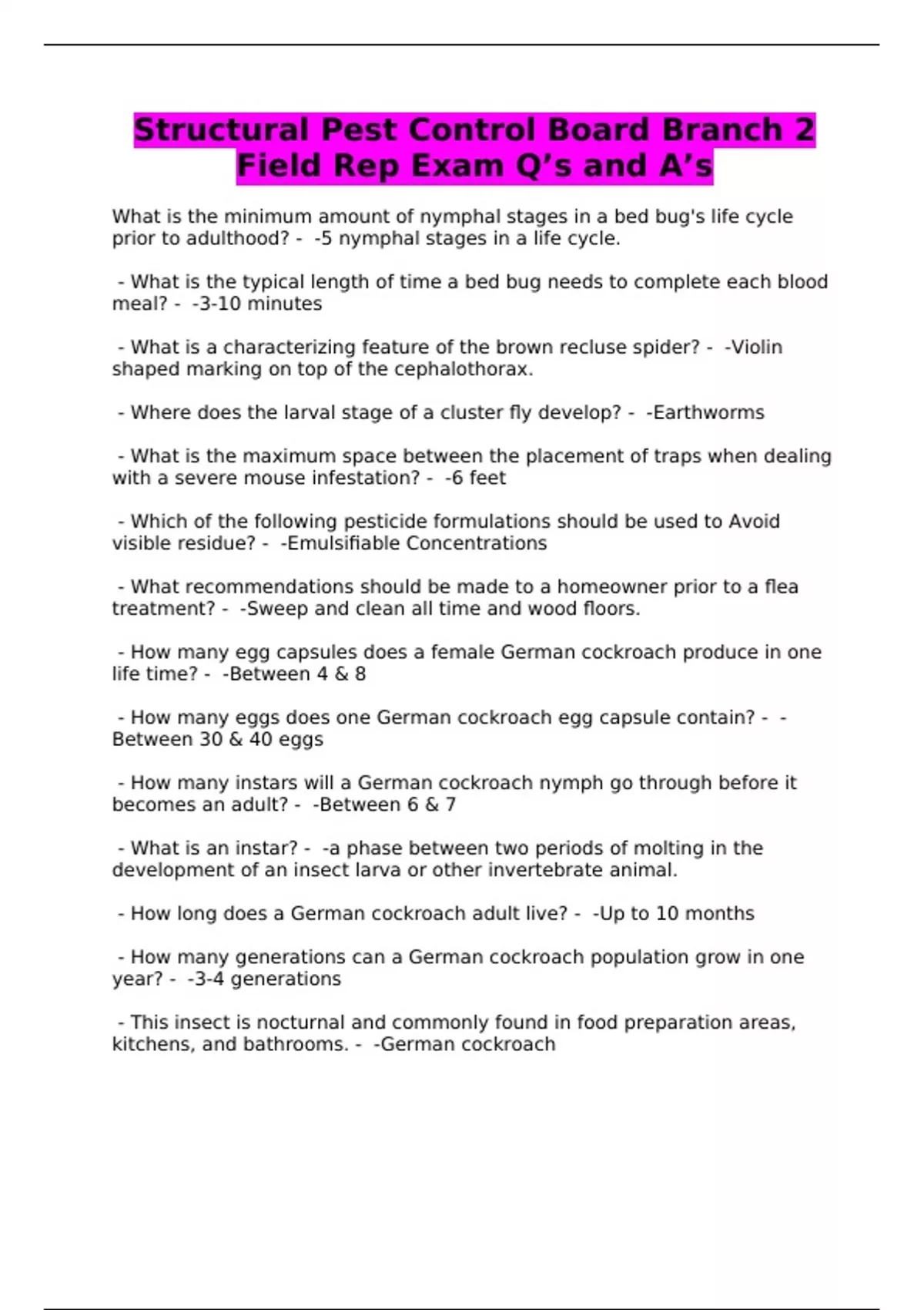 Structural Pest Control Board Branch 2 Field Rep Exam Q’s and A’s