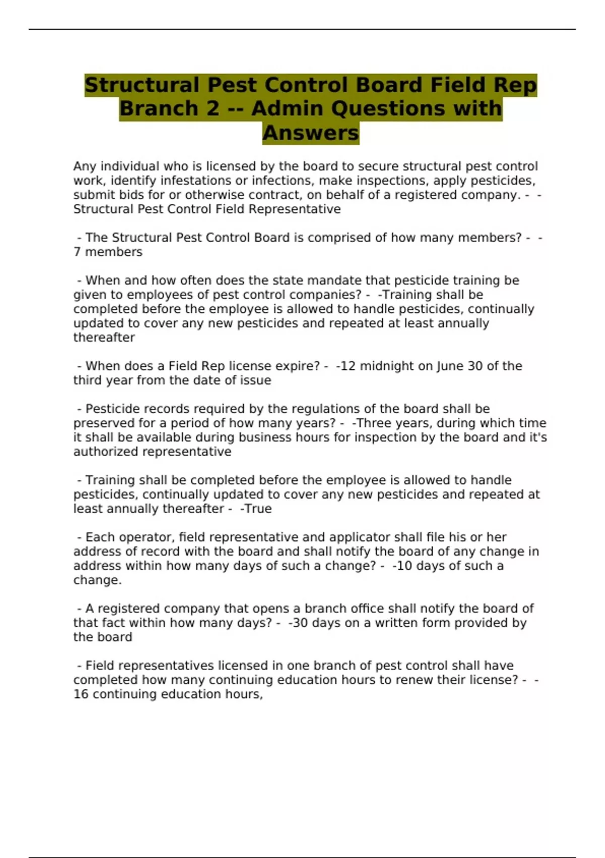 Structural Pest Control Board Field Rep Branch 2 -- Admin Questions with Answers
