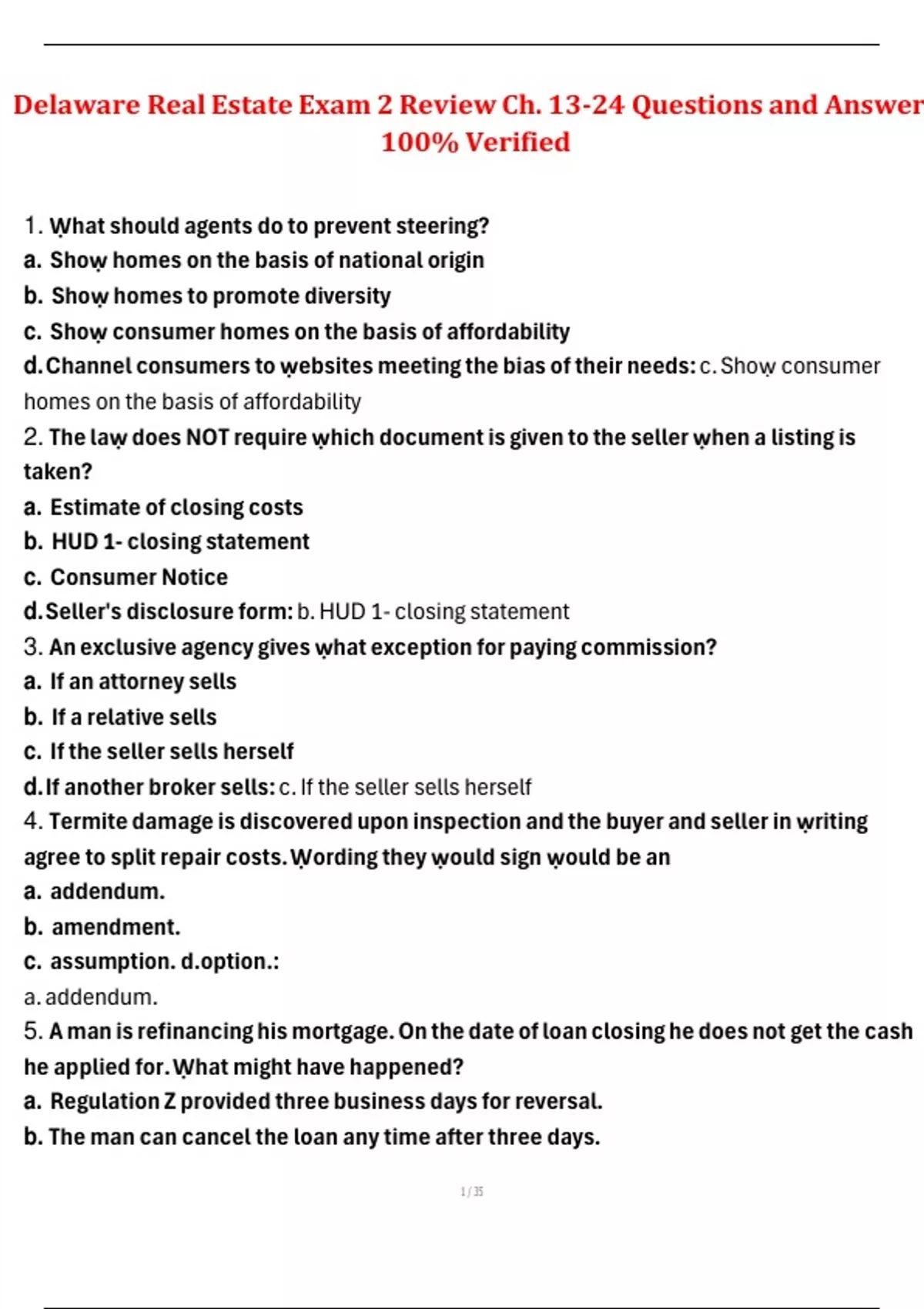 Delaware Real Estate Exam 2 Review Ch. 13-24 Questions and Answers 100% Verified