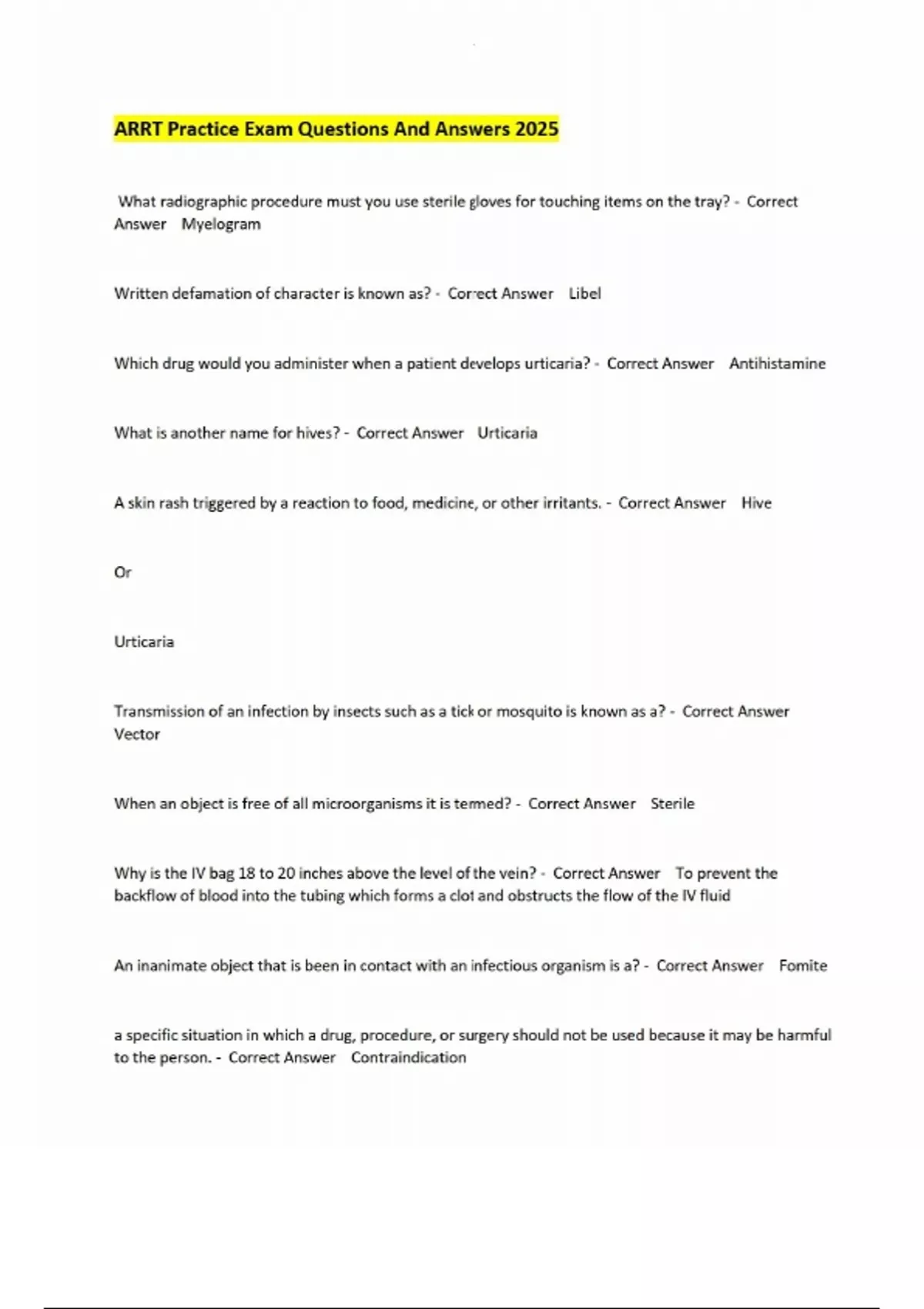 ARRT Practice Exam Questions And Answers 2025 What radiographic procedure must you use sterile gloves for touching items on the tray? - Correct Answer Myelogram Written defamation of character is known as? - Correct Answer Libel Which drug would you administer when a patient develops urticaria? - Correct Answer Antihistamine What is another name for hives? - Correct Answer Urticaria A skin rash triggered by a reaction to food, medicine, or other irritants. - Correct Answer Hive Or Urticaria Transmission of an infection by insects such as a tick or mosquito is known as a? - Correct Answer Vector When an object is free of all microorganisms it is termed? - Correct Answer Sterile Why is the IV bag 18 to 20 inches above the level of the vein? - Correct Answer To prevent the backflow of blood into the tubing which forms a clot and obstructs the flow of the IV fluid An inanimate object that is been in contact with an infectious organism is a? - Correct Answer Fomite a specific situation in which a drug, procedure, or surgery should not be used because it may be harmful to the person. - Correct Answer Contraindication The main advantage of using non-ionic water-soluble contrast media on the