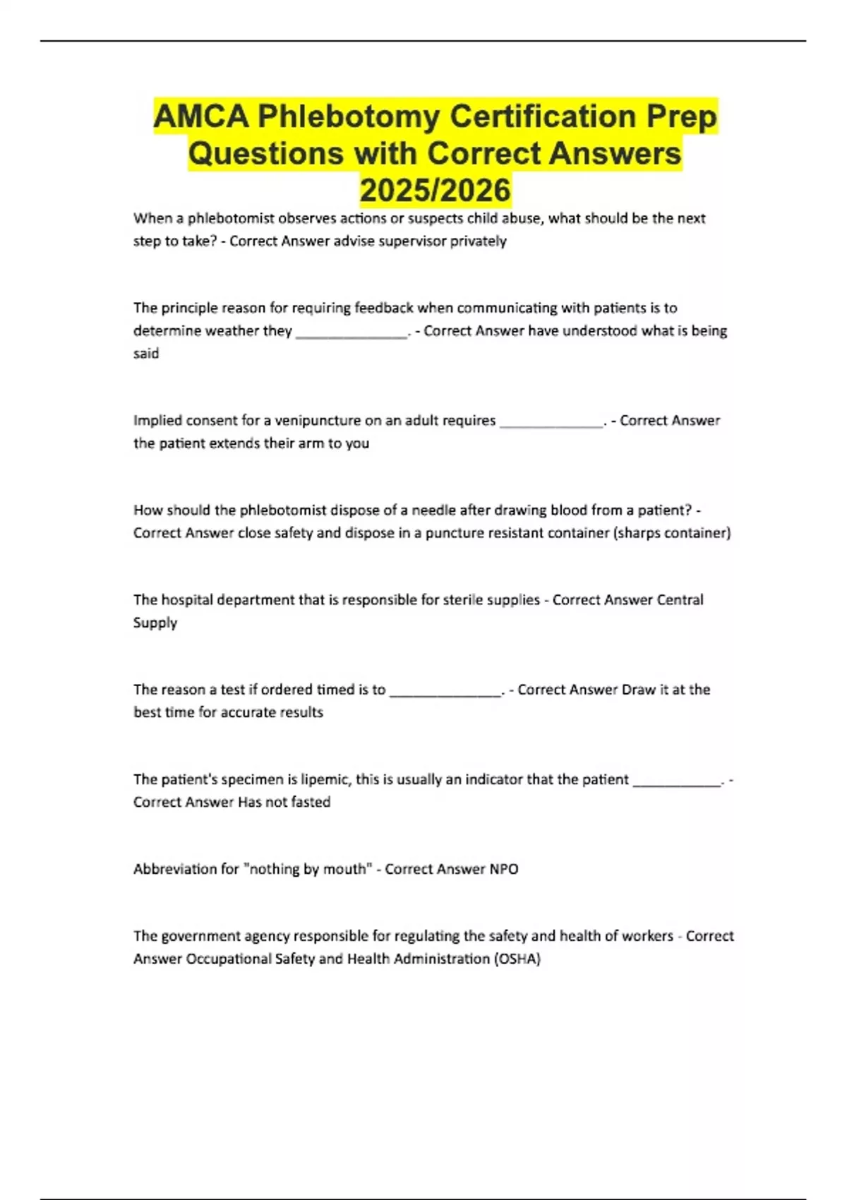 AMCA Phlebotomy Certification Prep Questions with Correct Answers 2025/2026 When a phlebotomist observes actions or suspects child abuse, what should be the next step to take? - Correct Answer advise supervisor privately The principle reason for requiring feedback when communicating with patients is to determine weather they ______________. - Correct Answer have understood what is being said Implied consent for a venipuncture on an adult requires _____________. - Correct Answer the patient extends their arm to you How should the phlebotomist dispose of a needle after drawing blood from a patient? - Correct Answer close safety and dispose in a puncture resistant container (sharps container) The hospital department that is responsible for sterile supplies - Correct Answer Central Supply The reason a test if ordered timed is to ______________. - Correct Answer Draw it at the best time for accurate results The patient's specimen is lipemic, this is usually an indicator that the patient ___________. - Correct Answer Has not fasted Abbreviation for "nothing by mouth" - Correct Answer NPO The government agency responsible for regulating the safety and health of workers - Correct Answer Occupational Safety and Health Administration (OSHA)