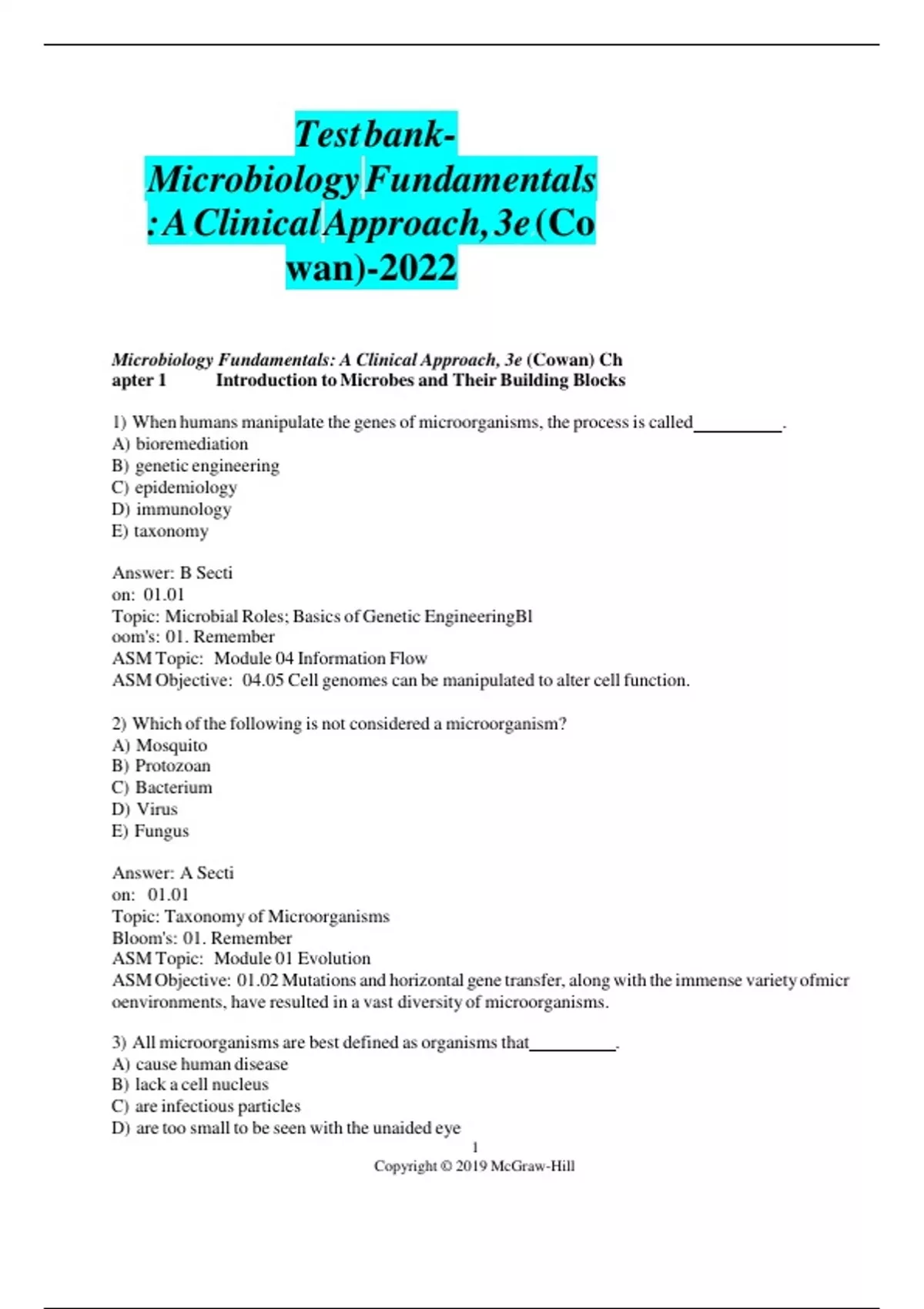 TEST BANK FOR MICROBIOLOGY FUNDAMENTALS A CLINICAL APPROACH 3RD EDITION BY COWAN ALL CHAPTERS