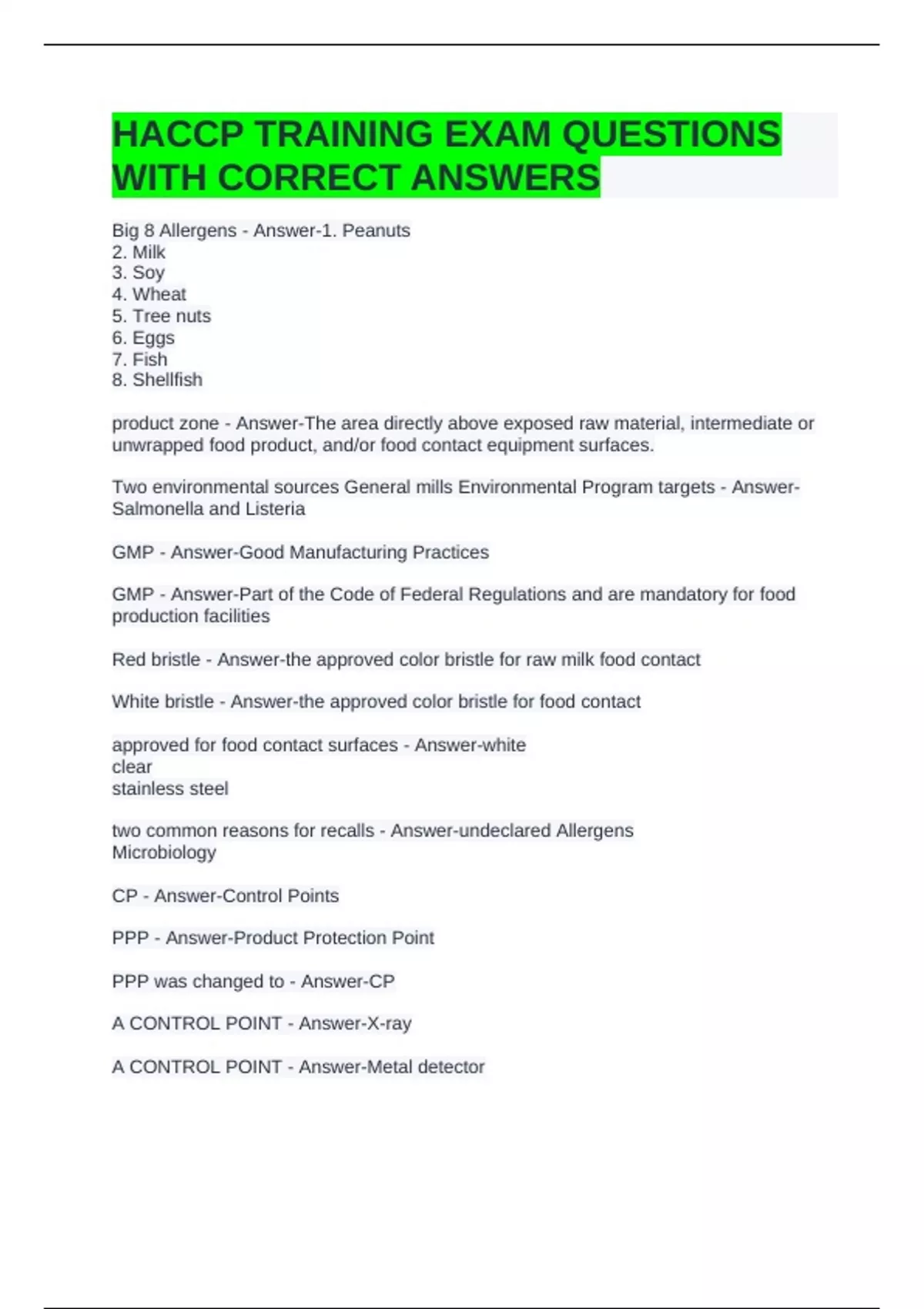 HACCP TRAINING EXAM QUESTIONS