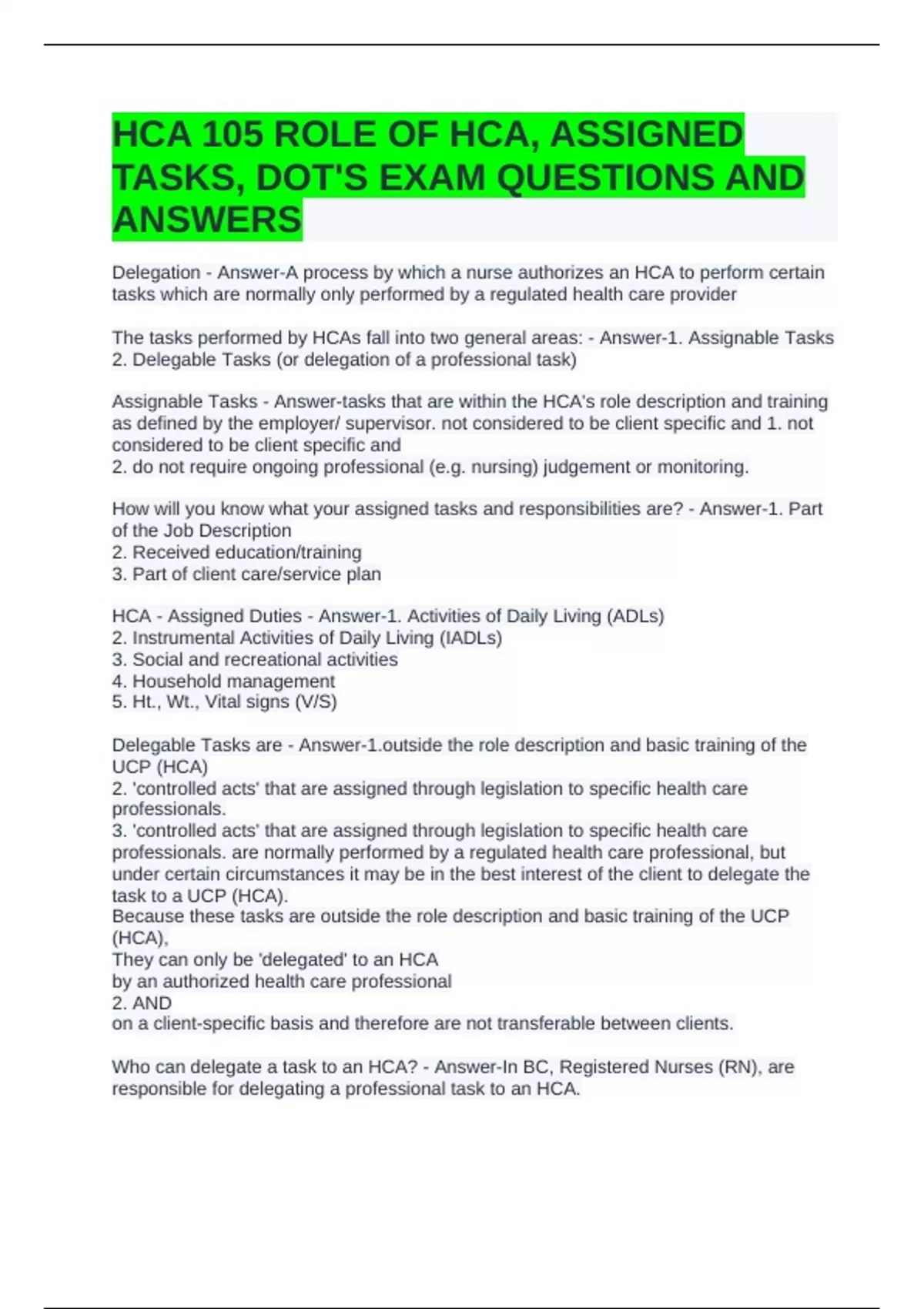 HCA - Assigned Duties - Answer-1. Activities of Daily Living (ADLs)