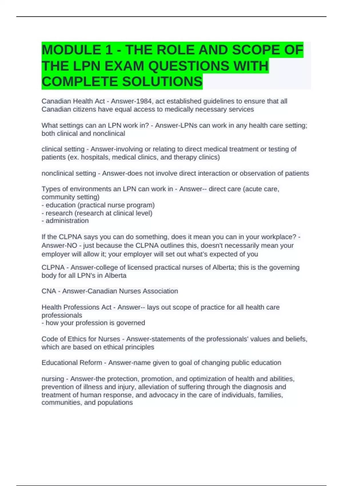 MODULE 1 - THE ROLE AND SCOPE OF THE LPN EXAM QUESTIONS WITH COMPLETE SOLUTIONS