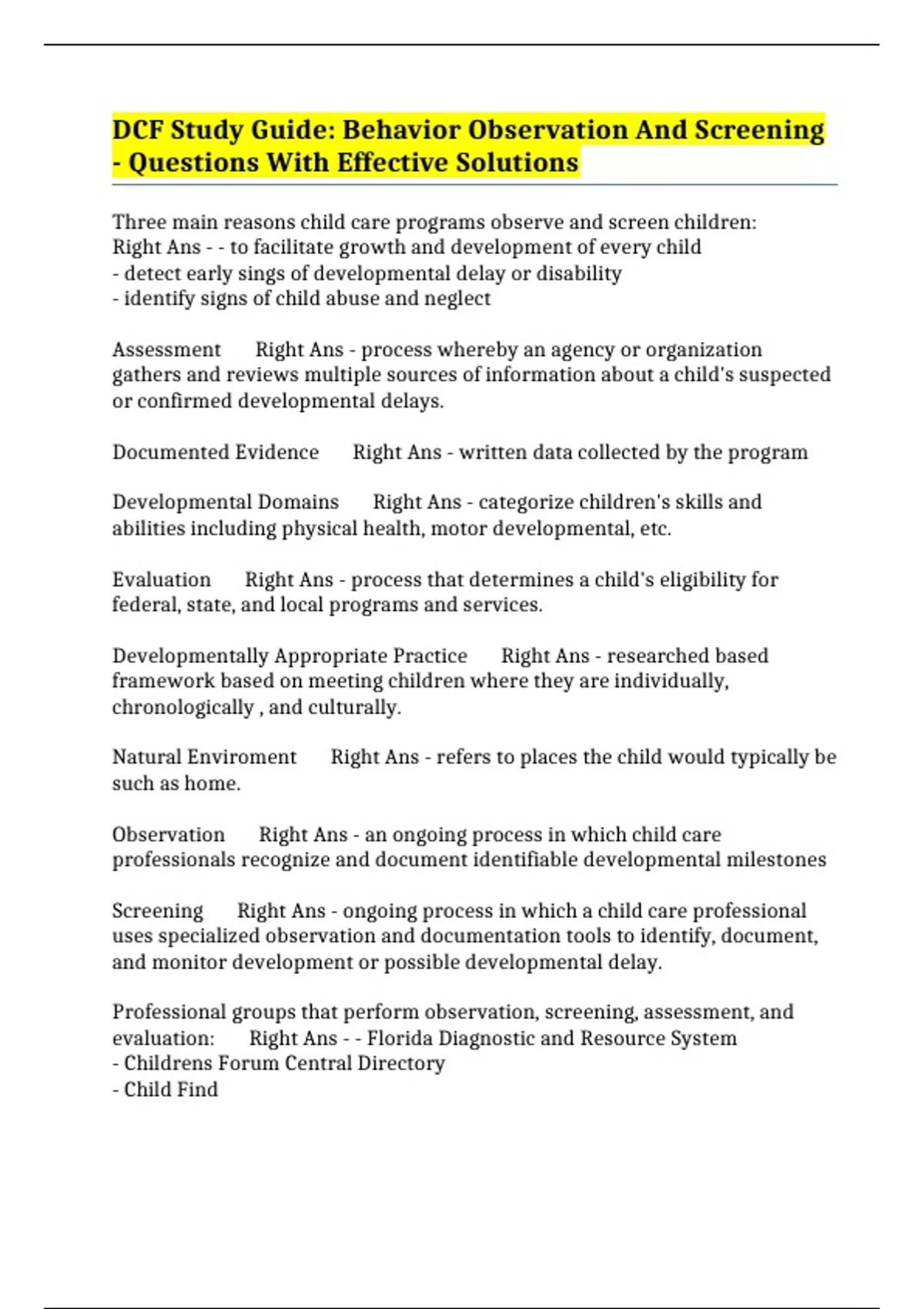 Screening Right Ans - ongoing process in which a child care professional