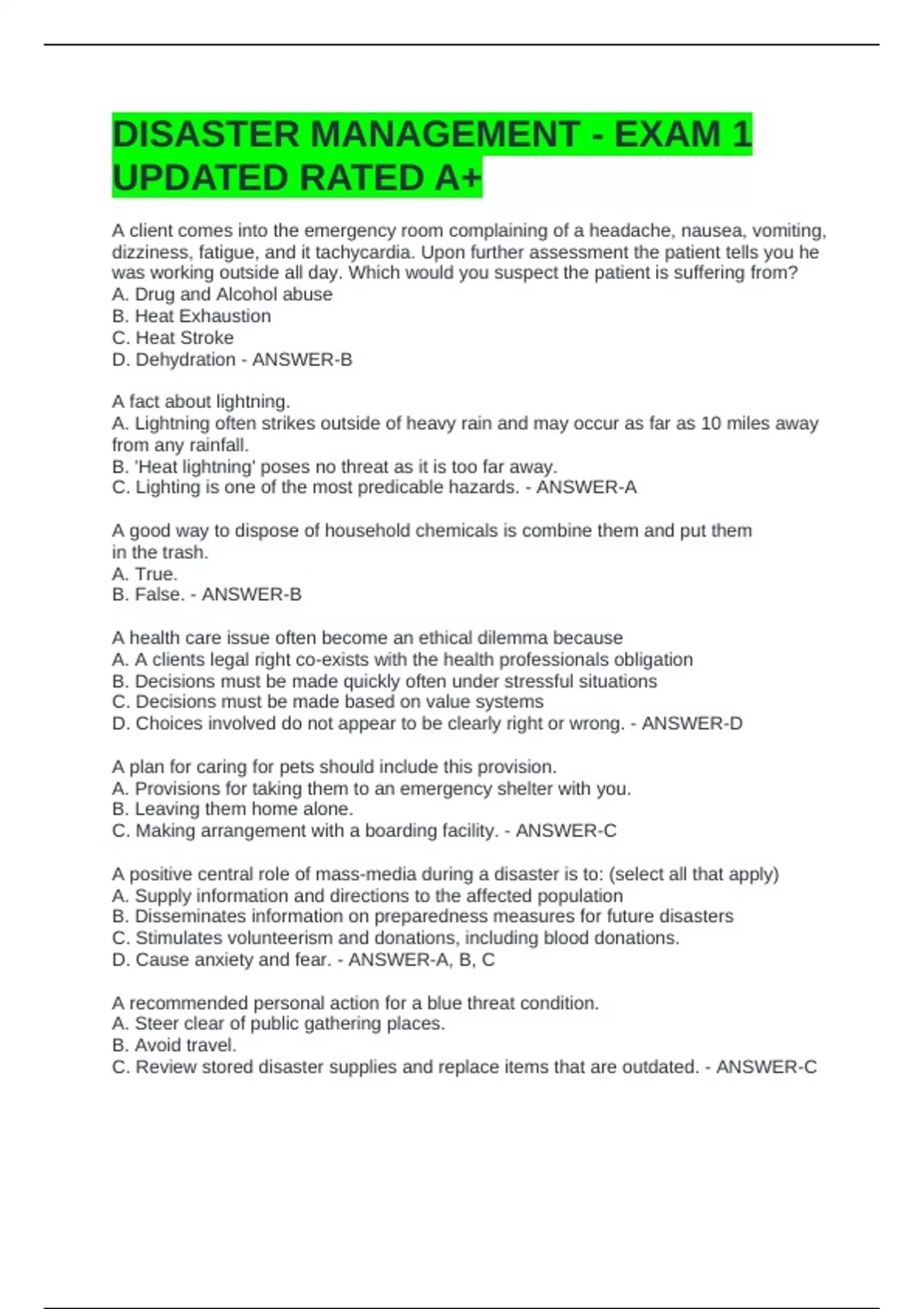 DISASTER MANAGEMENT - EXAM 1 UPDATED RATED A+