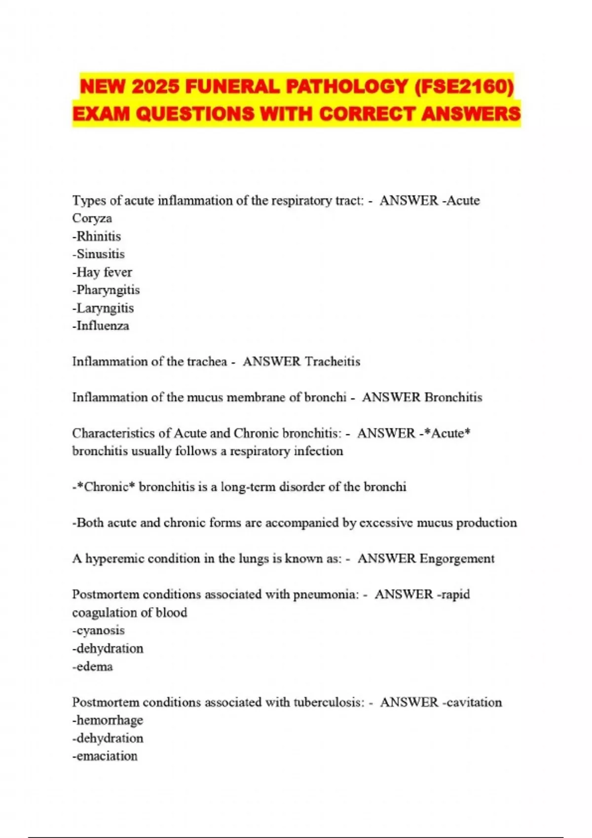 NEW 2025 FUNERAL PATHOLOGY (FSE2160) EXAM QUESTIONS WITH CORRECT ANSWERS ...