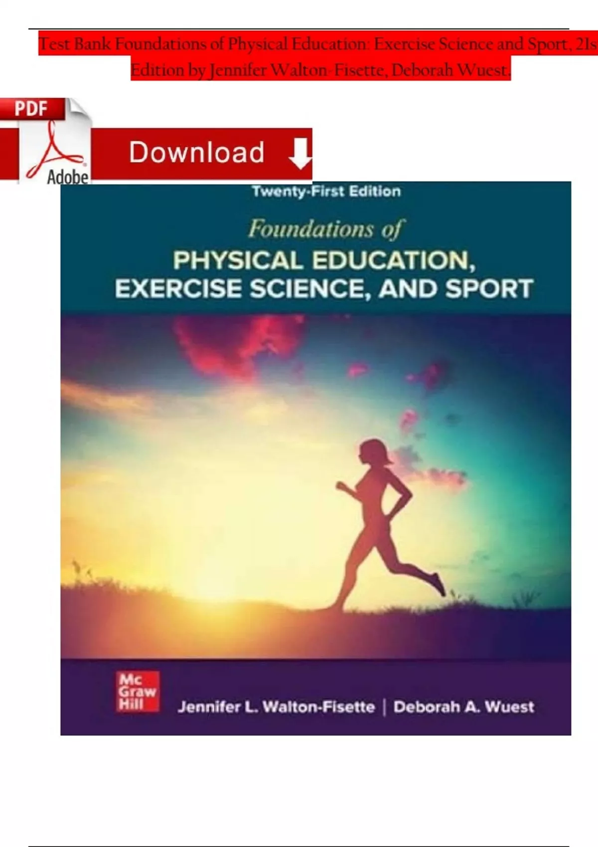 ***INSTANT PDF ACCESS FILE DOWNL*Comprehensive Test Bank for Foundations of Physical Education: Exercise Science and Sport, 21st Edition** Get instant access to a comprehensive test bank for the 21st edition of "Foundations of Physical Education: Exercise Science and Sport" by Jennifer Walton-Fisette and Deborah Wuest. This exhaustive resource covers all chapters of the textbook, providing instructors with a wealth of assessment materials to evaluate student understanding and progress. The test bank includes a wide range of question types, including multiple-choice, true/false, short-answer, and essay questions, ensuring that instructors can tailor their assessments to suit their teaching style and student needs. With this valuable resource, instructors can: * Create customized quizzes and exams with ease * Assess student knowledge and understanding of key concepts in physical education, exercise science, and sport * Save time and effort in developing assessment materials * Enhance student learning outcomes and academic achievement This newest version of the test bank is carefully crafted to align with the 21st edition of the textbook, ensuring that instructors have access to the most up-to-date and relevant assessment materials. Whether you're teaching an introductory course in physical education or a specialized course in exercise science and sport, this test bank is an essential resource for effective teaching and learning.OAD***