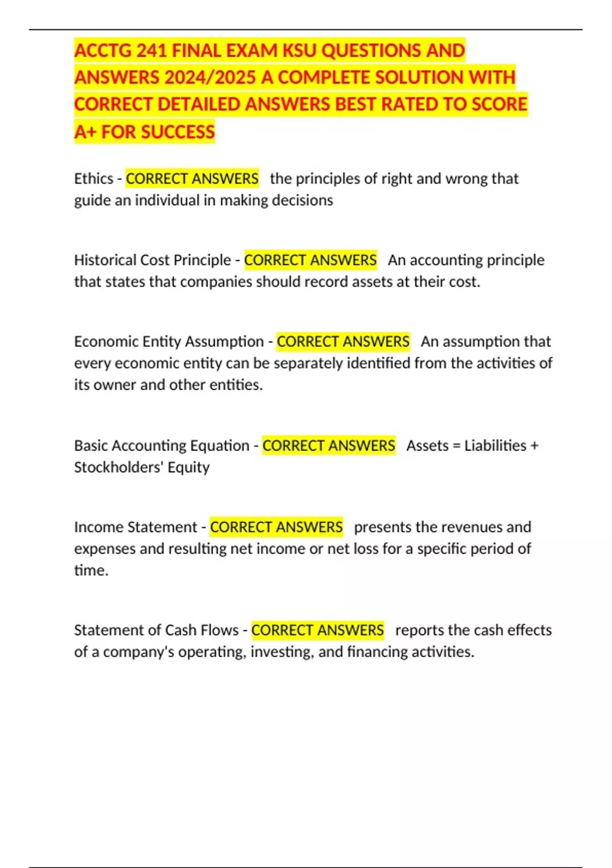 ACCTG 241 FINAL EXAM KSU QUESTIONS AND