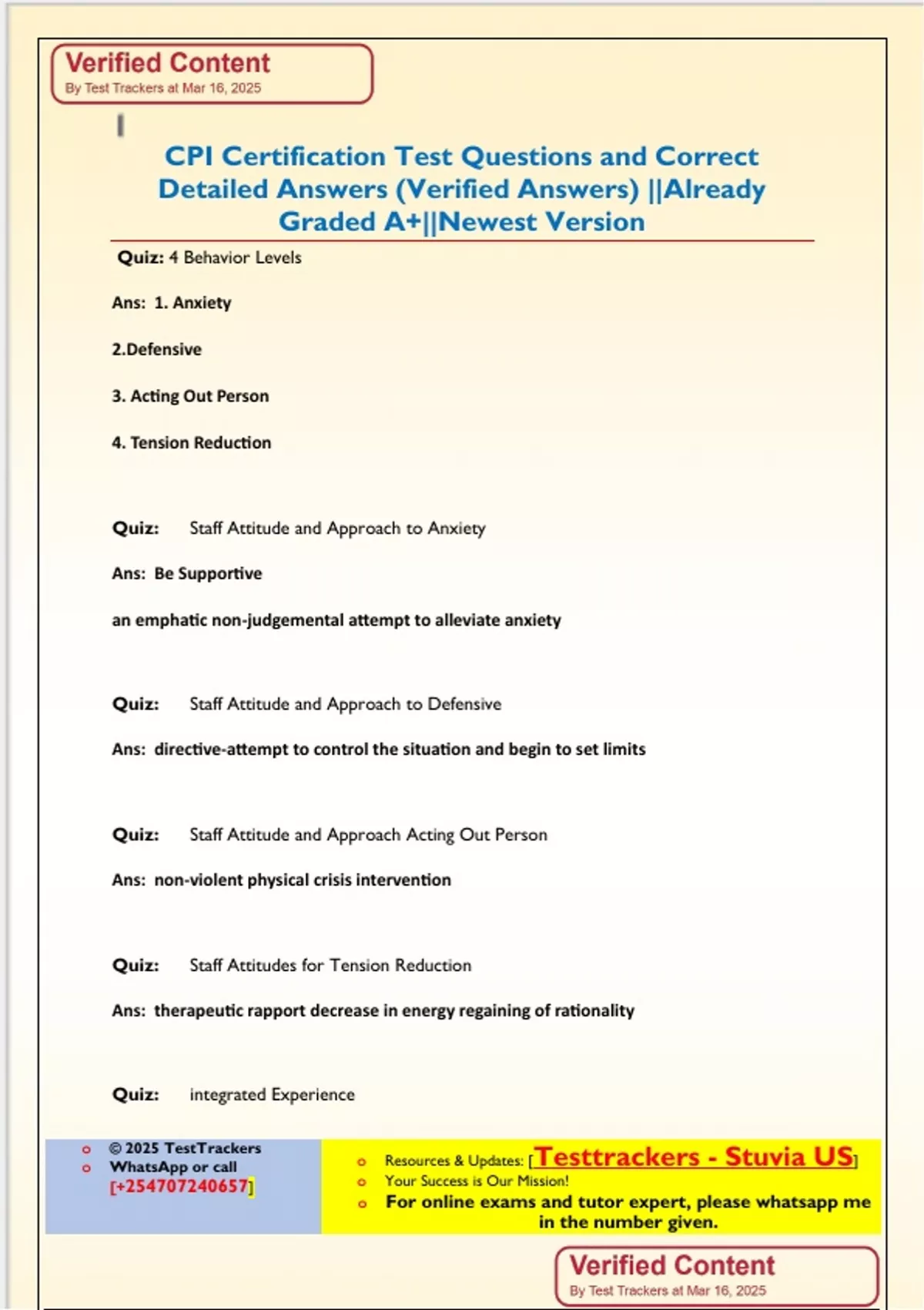 Quiz: 4 Behavior Levels Ans: 1. Anxiety 2.Defensive 3. Acting Out Person 4. Tension Reduction Quiz: Staff Attitude and Approach to Anxiety Ans: Be Supportive an emphatic non-judgemental attempt to alleviate anxiety Quiz: Staff Attitude and Approach to Defensive Ans: directive-attempt to control the situation and begin to set limits Quiz: Staff Attitude and Approach Acting Out Person Ans: non-violent physical crisis intervention Quiz: Staff Attitudes for Tension Reduction Ans: therapeutic rapport decrease in energy regaining of rationality Quiz: integrated Experience o © 2025 TestTrackers o or call [] o Resources & Updates: [Testtrackers - Stuvia US] o Your Success is Our Mission! o For online exams and tutor expert, please me in the number given. Ans: we can set the tone for whether or not the behavior escalates or de-escalates Quiz: non-verbal-proxemics (personal space) Ans: area surrounding your body considered an extension of self. 1 1/2 to 3 feet (typically) culture, height, gender, age, status, appearance, and familiarity. Quiz: kinesics (body language) Ans: non-verbal message transmitted by motion and body posture. Factors: eye contact, facial expressions send a very strong message gestures, how we stand (stance) hands Quiz: 3 reasons for using the CPI supportive stance Ans: safety less threatening communicates respect Quiz: components of the communication pyramid Ans: verbal communication, para verbal coomunication, and non-verbal communication Quiz: what is paraverbal communication Ans: how we say what we say Quiz: three components of paraverbal communication o © 2025 TestTrackers o or call [] o Resources & Updates: [Testtrackers - Stuvia US] o Your Success is Our Mission! o For online exams and tutor expert, please me in the number given. Ans: ton