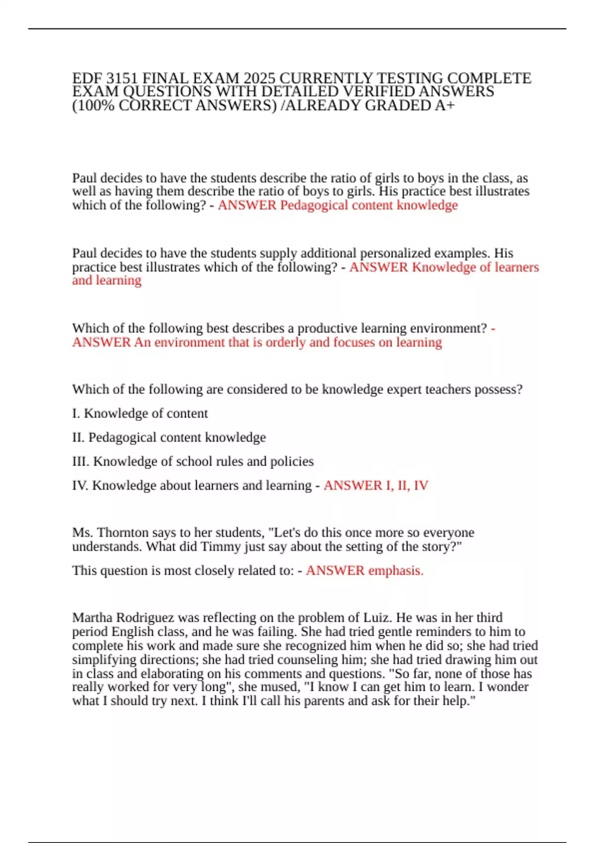 EDF 3151 FINAL EXAM 2025 CURRENTLY TESTING COMPLETE EXAM QUESTIONS WITH DETAILED VERIFIED ANSWERS (100% CORRECT ANSWERS) /ALREADY GRADED A+