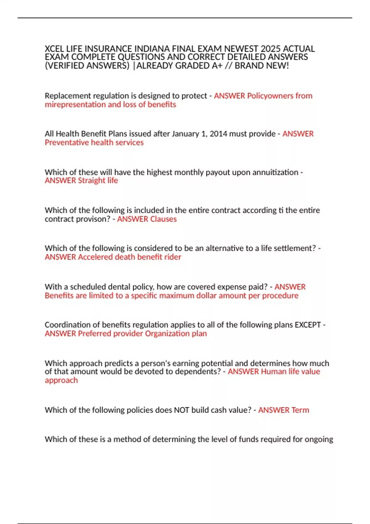 XCEL LIFE INSURANCE INDIANA FINAL EXAM NEWEST 2025 ACTUAL
