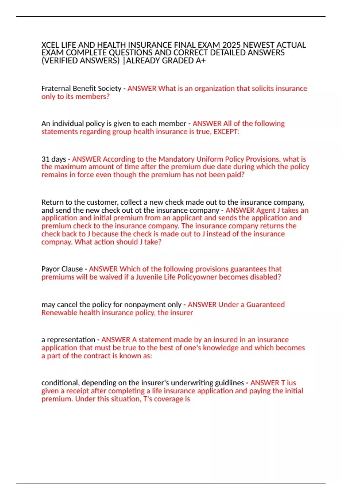 XCEL LIFE AND HEALTH INSURANCE FINAL EXAM 2025 NEWEST ACTUAL EXAM COMPLETE QUESTIONS AND CORRECT DETAILED ANSWERS (VERIFIED ANSWERS) |ALREADY GRADED A+