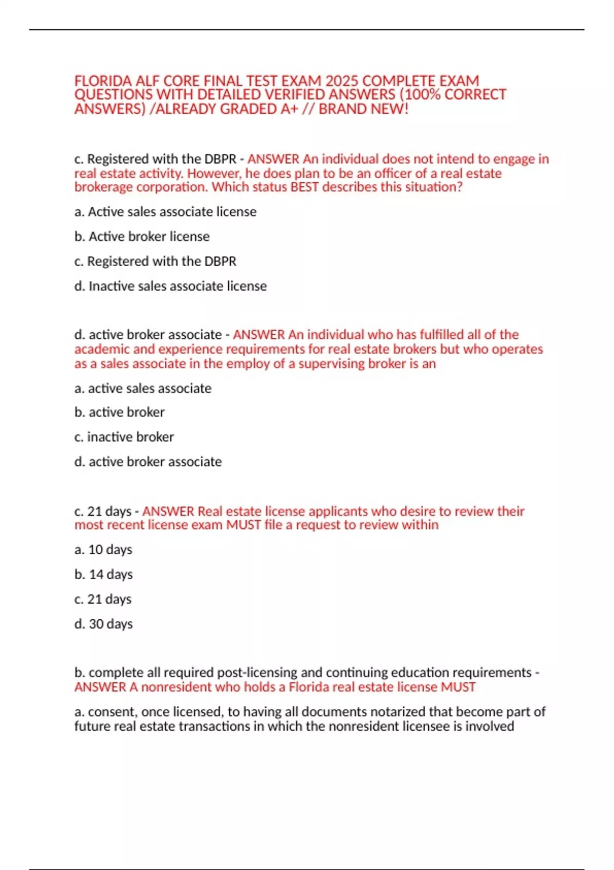 FLORIDA ALF CORE FINAL TEST EXAM 2025 COMPLETE EXAM QUESTIONS WITH DETAILED VERIFIED ANSWERS (100% CORRECT ANSWERS) /ALREADY GRADED A+ // BRAND NEW!