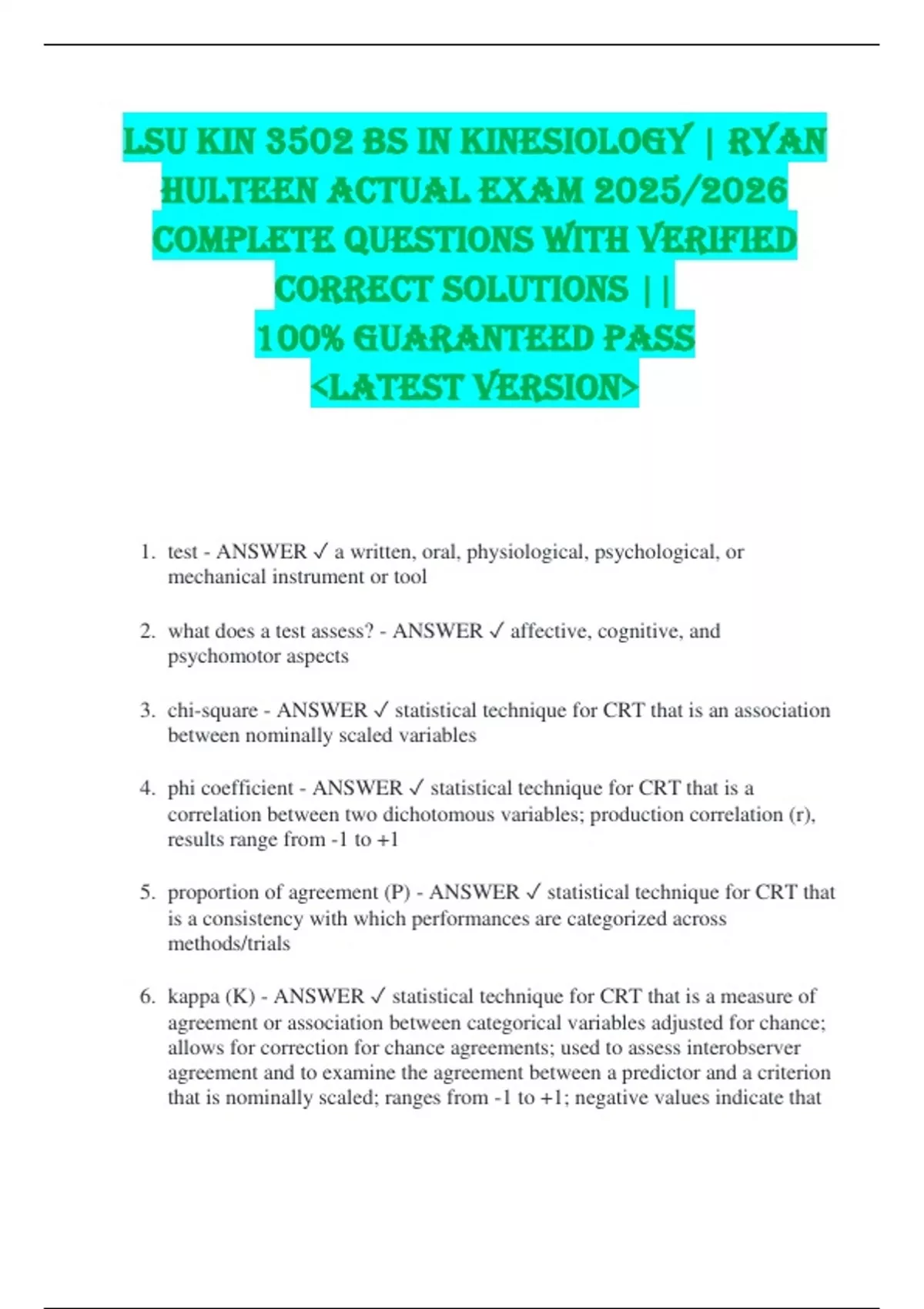 1. test - ANSWER ✓ a written, oral, physiological, psychological, or