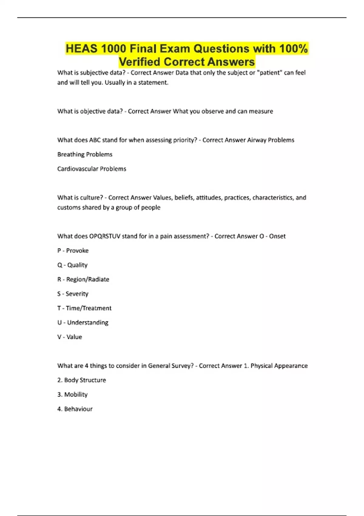 HEAS 1000 Final Exam Questions with 100% Verified Correct Answers What is subjective data? - Correct Answer Data that only the subject or "patient" can feel and will tell you. Usually in a statement. What is objective data? - Correct Answer What you observe and can measure What does ABC stand for when assessing priority? - Correct Answer Airway Problems Breathing Problems Cardiovascular Problems What is culture? - Correct Answer Values, beliefs, attitudes, practices, characteristics, and customs shared by a group of people What does OPQRSTUV stand for in a pain assessment? - Correct Answer O - Onset P - Provoke Q - Quality R - Region/Radiate S - Severity T - Time/Treatment U - Understanding V - Value What are 4 things to consider in General Survey? - Correct Answer 1. Physical Appearance 2. Body Structure 3. Mobility 4. Behaviour