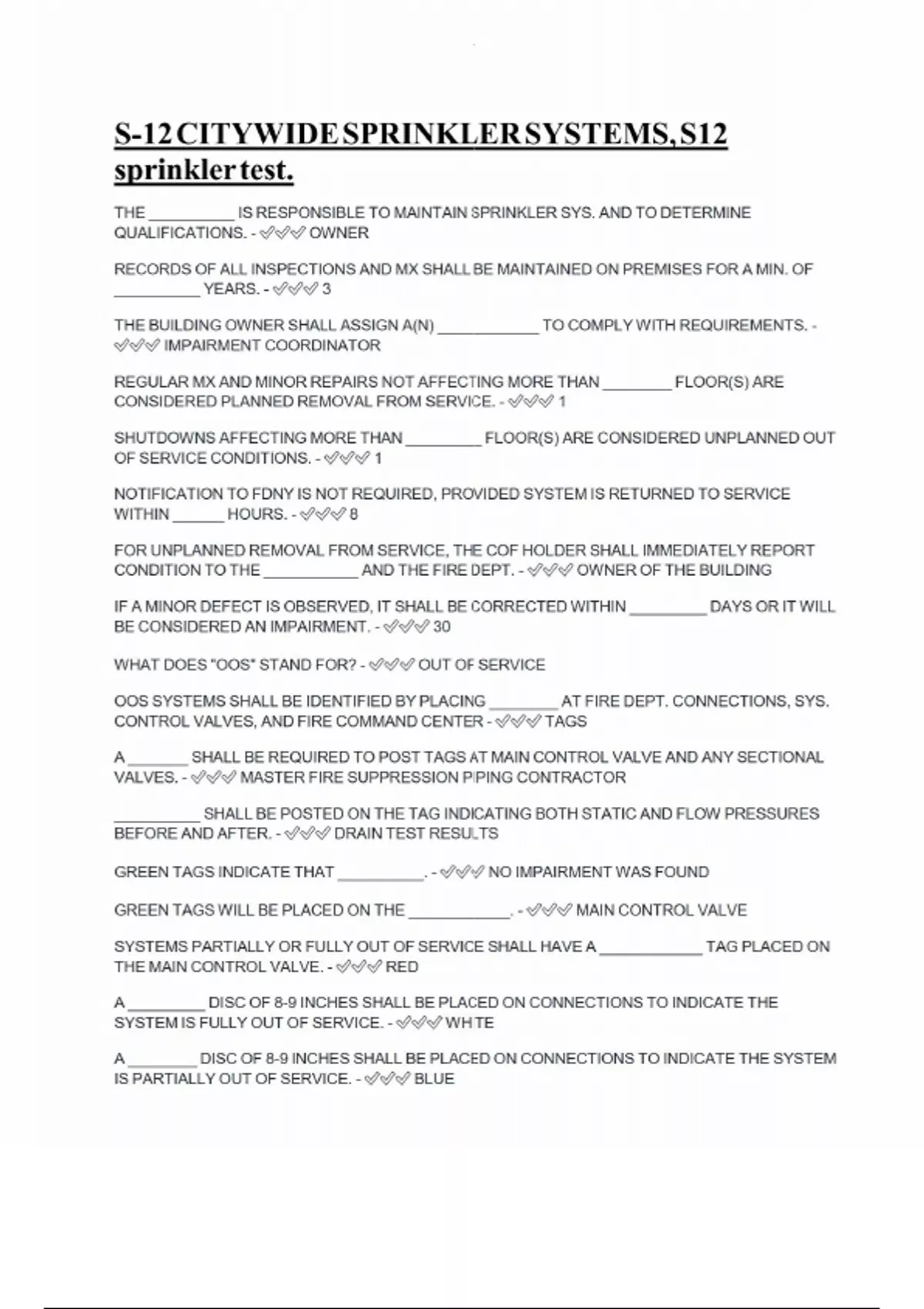 THE __________ IS RESPONSIBLE TO MAINTAIN SPRINKLER SYS. AND TO DETERMINE QUALIFICATIONS. - OWNER RECORDS OF ALL INSPECTIONS AND MX SHALL BE MAINTAINED ON PREMISES FOR A MIN. OF __________ YEARS. - 3 THE BUILDING OWNER SHALL ASSIGN A(N) ____________ TO COMPLY WITH REQUIREMENTS. - IMPAIRMENT COORDINATOR REGULAR MX AND MINOR REPAIRS NOT AFFECTING MORE THAN ________ FLOOR(S) ARE CONSIDERED PLANNED REMOVAL FROM SERVICE. - 1 SHUTDOWNS AFFECTING MORE THAN _________ FLOOR(S) ARE CONSIDERED UNPLANNED OUT OF SERVICE CONDITIONS