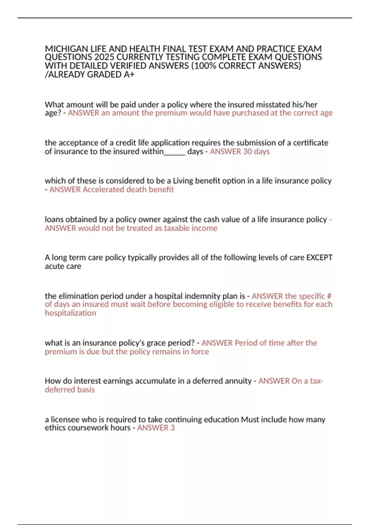 MICHIGAN LIFE AND HEALTH FINAL TEST EXAM AND PRACTICE EXAM QUESTIONS 2025 CURRENTLY TESTING COMPLETE EXAM QUESTIONS WITH DETAILED VERIFIED ANSWERS (100% CORRECT ANSWERS) /ALREADY GRADED A+