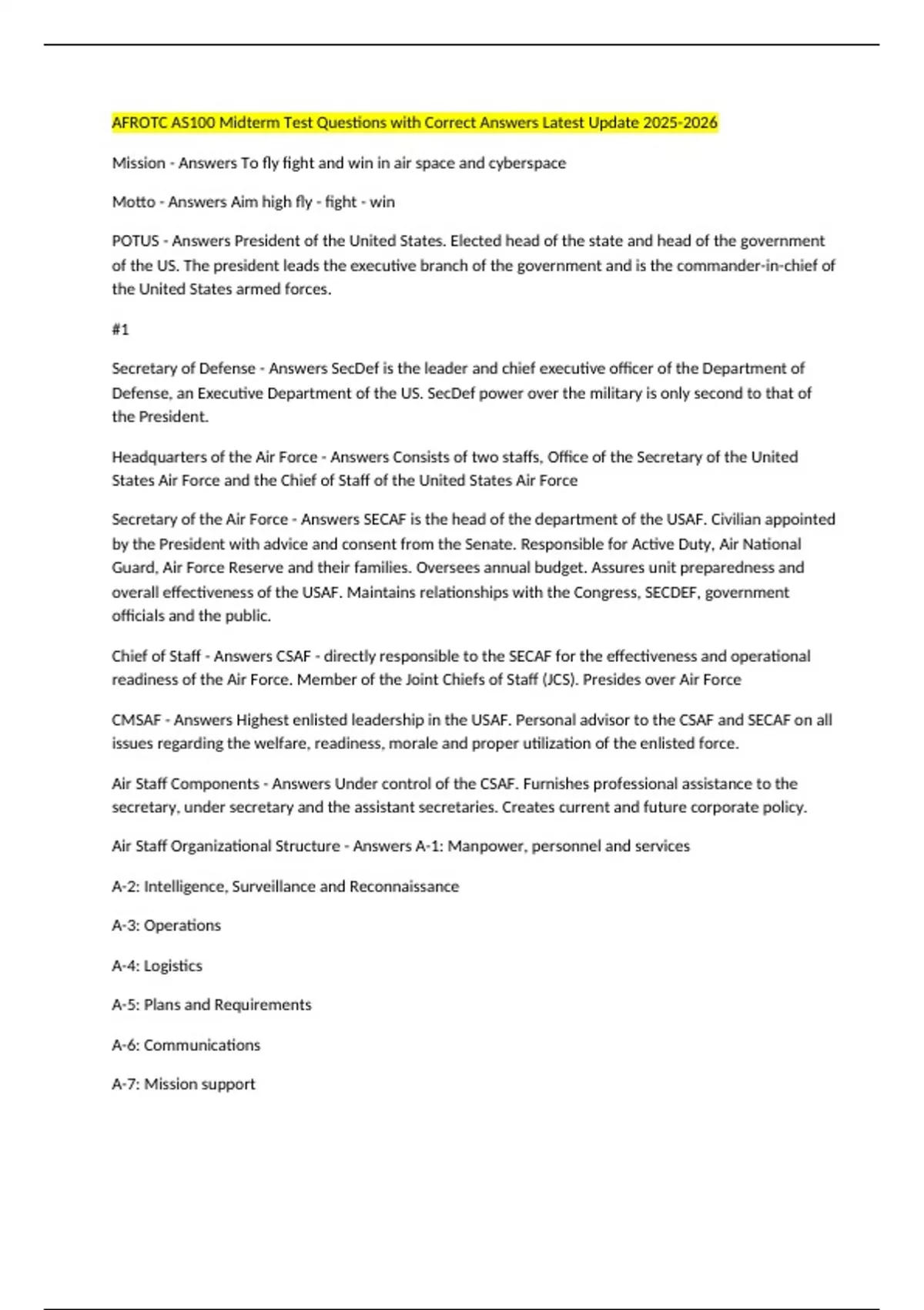 Air Staff Components - Answers Under control of the CSAF. Furnishes professional assistance to the