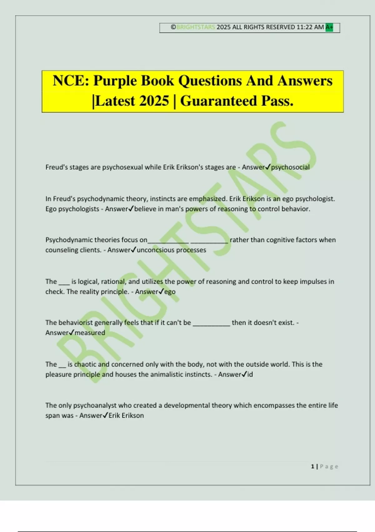 ©BRIGHTSTARS 2025 ALL RIGHTS RESERVED 11:22 AM A+ 1 | P a g e NCE: Purple Book Questions And Answers |Latest 2025 | Guaranteed Pass. Freud's stages are psychosexual while Erik Erikson's stages are - Answerpsychosocial In Freud's psychodynamic theory, instincts are emphasized. Erik Erikson is an ego psychologist. Ego psychologists - Answerbelieve in man's powers of reasoning to control behavior. Psychodynamic theories focus on___________ __________ rather than cognitive factors when counseling clients. - Answerunconcsious processes The ___ is logical, rational, and utilizes the power of reasoning and control to keep impulses in check. The reality principle. - Answerego The behaviorist generally feels that if it can't be __________ then it doesn't exist. - Answermeasured The __ is chaotic and concerned only with the body, not with the outside world. This is the pleasure principle and houses the animalistic instincts. - Answerid The only psychoanalyst who created a developmental theory which encompasses the entire life span was - AnswerErik Erikson ©BRIGHTSTARS 2025 ALL RIGHTS RESERVED 11:22 AM A+ 2 | P a g e The statement "the ego is dependent on the id" would most likely reflect the work of - AnswerSigmund Freud Known for his ideas related to adult cognitive development; especially regarding college students. Stresses a concept known as dualistic thinking, common to teens in which things are conceptualized as good or bad or right or wrong. - AnswerRobert Perry Known for his work in strategic and problem-solving therapy, often utilizing the technique of paradox. Claims to have acquired information by studying works of Milton H. Erickson. - AnswerJay Haley Considered a pioneer in the behavior therapy movement, especially in regard to the use of systematic desensitization, a technique which helps client cope with phobias. Today his name is associated with multimodal therapy. - AnswerArnold Lazarus Known figure in the area of adult cognitive development. His model stresses interpersonal development. His theory is billed as a "constructive model of development, meaning that individuals construct reality through the lifespan." - AnswerRobert Keegan Jean Piaget's idiographic approach created his theory with four stages. The correct order from stage 1 to stage 4 is - Answersensorimotor, preoperations, concrete operations, formal operations Idiographic approaches to theories, such as Freud and Piaget, examine _________ in depth. - Answerindividuals In contrast to idiographic approaches, nomothetic approaches (such as behaviorism or the DSM) student general principles that apply to - Answerthe population ©BRIGHTSTARS 2025 ALL RIGHTS RESERVED 11:22 AM A+ 3 | P a g e Some behavioral scientists have been critical of Swiss child psychologist Jean Piaget's developmental research inasmuch as - Answerhis findings were often derived from observing his own children A tall skinny pitcher of water is emptied into a small squatty pitcher. A child indicated that she feels the small pitcher has less water. The child has not yet mastered - Answerconservation In Piaget's theory, the term __________ refers to the notion that a substance's weight, mass, and volume remain the same even if it changes shape. According to Piaget, the child masters this concept during the concrete operations stage (7-11 years). - Answerconservation Conservation and counting belong in which Piaget stage? - AnswerConcrete Operations In Piagetian literature, conservation would most likely refer to - Answervolume or mass __________ expanded on Piaget's conceptualization of moral development. - AnswerLawrence Kohlberg He disagreed with Piaget's notion that developmental stages take place naturally, insisting that the stages unfold due to educational intervention. - AnswerLev Vygotsky Perhaps the leading theorist in moral development. Used stories to determine the level of moral development in children.. - AnswerLawrence Kohlberg Father of American behaviorism and coined the term "behaviorism" in 1912. - AnswerJohn B. Watson Kohlberg, Erikson, and Maslow's theories are said to be ________ in nature, meaning each stage emerges from the