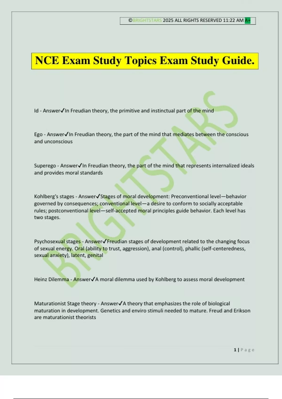 ©BRIGHTSTARS 2025 ALL RIGHTS RESERVED 11:22 AM A+ 1 | P a g e NCE Exam Study Topics Exam Study Guide. Id - AnswerIn Freudian theory, the primitive and instinctual part of the mind Ego - AnswerIn Freudian theory, the part of the mind that mediates between the conscious and unconscious Superego - AnswerIn Freudian theory, the part of the mind that represents internalized ideals and provides moral standards Kohlberg's stages - AnswerStages of moral development: Preconventional level—behavior governed by consequences; conventional level—a desire to conform to socially acceptable rules; postconventional level—self-accepted moral principles guide behavior. Each level has two stages. Psychosexual stages - AnswerFreudian stages of development related to the changing focus of sexual energy. Oral (ability to trust, aggression), anal (control), phallic (self-centeredness, sexual anxiety), latent, genital Heinz Dilemma - AnswerA moral dilemma used by Kohlberg to assess moral development Maturationist Stage theory - AnswerA theory that emphasizes the role of biological maturation in development. Genetics and enviro stimuli needed to mature. Freud and Erikson are maturationist theorists ©BRIGHTSTARS 2025 ALL RIGHTS RESERVED 11:22 AM A+ 2 | P a g e Empiricism - AnswerAKA behaviorism. The theory that all knowledge is derived from experience. Developmental stages can be measured, quantitative. Organicism - AnswerOpposite of empiricism. Developmental change can be internal. theory that living organisms are fundamentally different from non-living entities. Qualitative change Structuralist - AnswerExample of Piaget's view of stages of development.. Qualitative change. A psychologist who analyzes the basic elements of consciousness Equilibration - AnswerThe process of achieving balance between assimilation and accommodation in Piaget's theory Lorenz theory - AnswerThe theory that aggression is natural and evolutionary. Lorenz studied critical periods and imprinting Ego psychologists - AnswerPsychologists who believe in man's power of reasoning to control behavior Formal operational stage - AnswerThe stage of cognitive development characterized by abstract thought and deduction. Age 12 and older Preoperational stage - AnswerPiaget's stage of cognitive development characterized by symbolic thinking and egocentrism. Centration: focus all attention on one characteristic. Age 2- 7 Ethnocentrism - AnswerThe belief in the inherent superiority of one's own ethnic group or culture Cognitive Dissonance Theory - AnswerThe theory that individuals experience discomfort when their beliefs and behaviors
