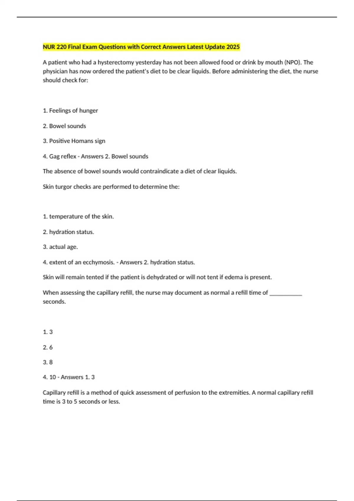 NUR 220 Final Exam Questions with Correct Answers Latest Update 2025 A patient who had a hysterectomy yesterday has not been allowed food or drink by mouth (NPO). The physician has now ordered the patient's diet to be clear liquids. Before administering the diet, the nurse should check for: 1. Feelings of hunger 2. Bowel sounds 3. Positive Homans sign 4. Gag reflex - Answers 2. Bowel sounds The absence of bowel sounds would contraindicate a diet of clear liquids. Skin turgor checks are performed to determine the: 1. temperature of the skin. 2. hydration status. 3. actual age. 4. extent of an ecchymosis. - Answers 2. hydration status. Skin will remain tented if the patient is dehydrated or will not tent if edema is present. When assessing the capillary refill, the nurse may document as normal a refill time of __________ seconds. 1. 3 2. 6 3. 8 4. 10 - Answers 1. 3 Capillary refill is a method of quick assessment of perfusion to the extremities. A normal capillary refill time is 3 to 5 seconds or less. The nurse should include the proper use of an incentive spirometer in teaching a preoperative patient. Postoperative monitoring of this patient would reveal that the incentive spirometry has been effective if the patient has: 1. Adventitious breath sounds 2. Expiratory wheezing 3. Thick, green respiratory secretions 4. Clear breath sounds - Answers 4. Clear breath sounds An incentive spirometer is used to promote lung expansion, which opens airways, reduces atelectasis, and stimulates coughing to clear secretions. Which of the following is an ABCD characteristic of malignant melanoma? 1. Asymmetric borders 2. Borders well demarcated 3. Color of lesion is uniform 4. Diameter less than 6 mm - Answers 1. Asymmetric borders ABCD melanoma mnemonic includes asymmetry, borders that are irregular, color that is not the same all over, and diameter larger than 6 mm and growing. A patient who has just undergone a colon resection complains to the nurse that he felt something pop under his dressing while trying to get out of bed. The nurse removes the dressing and finds that dehiscence of the wound has occurred. The nurse's first action should be to: 1. Replace the dressing; dehiscence is normal. 2. Call the physician. 3. Pull the wound edges together, and replace the dressing. 4. Cover the wound with sterile dressings saturated with normal saline. - Answers 4. Cover the wound with sterile dressings saturated with normal saline. The first action of the nurse should be to cover the wound with saline-saturated dressings to prevent damage of the exposed organs from drying and then to call the physician. A patient who had been complaining of intolerable stress at work has demonstrated the ability to use progressive muscle relaxation and deep breathing techniques. He will return to the clinic for follow-up evaluation in 2 weeks. Which data will best suggest that the patient is successfully using these techniques to cope more effectively with stre