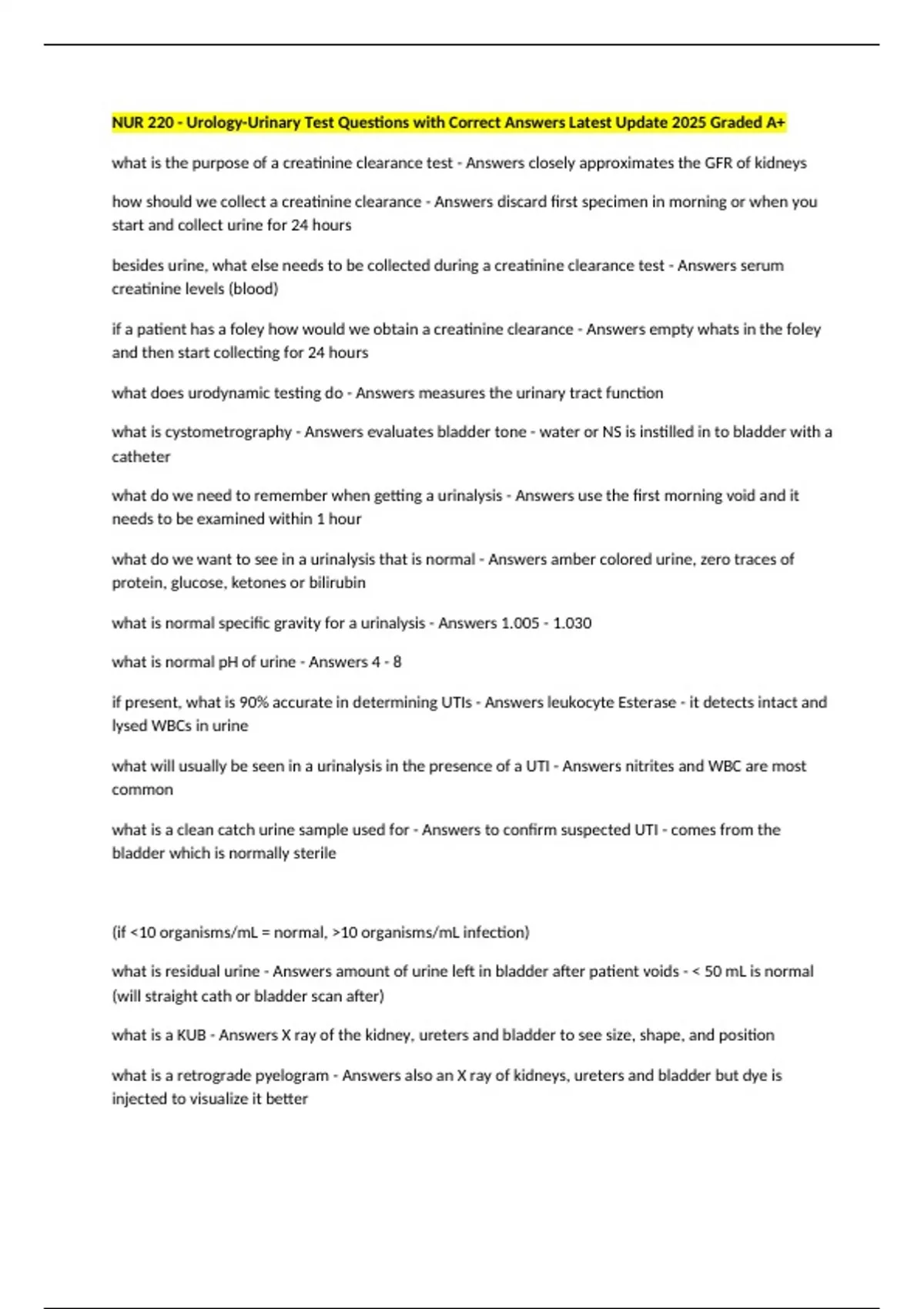 NUR 220 - Urology-Urinary Test Questions with Correct Answers Latest Update 2025 Graded A+ what is the purpose of a creatinine clearance test - Answers closely approximates the GFR of kidneys how should we collect a creatinine clearance - Answers discard first specimen in morning or when you start and collect urine for 24 hours besides urine, what else needs to be collected during a creatinine clearance test - Answers serum creatinine levels (blood) if a patient has a foley how would we obtain a creatinine clearance - Answers empty whats in the foley and then start collecting for 24 hours what does urodynamic testing do - Answers measures the urinary tract function what is cystometrography - Answers evaluates bladder tone - water or NS is instilled in to bladder with a catheter what do we need to remember when getting a urinalysis - Answers use the first morning void and it needs to be examined within 1 hour what do we want to see in a urinalysis that is normal - Answers amber colored urine, zero traces of protein, glucose, ketones or bilirubin what is normal specific gravity for a urinalysis - Answers 1.005 - 1.030 what is normal pH of urine - Answers 4 - 8 if present, what is 90% accurate in determining UTIs - Answers leukocyte Esterase - it detects intact and lysed WBCs in urine what will usually be seen in a urinalysis in the presence of a UTI - Answers nitrites and WBC are most common what is a clean catch urine sample used for - Answers to confirm suspected UTI - comes from the bladder which is normally sterile (if 10 organisms/mL = normal, 10 organisms/mL infection) what is residual urine - Answers amount of urine left in bladder after patient voids - 50 mL is normal (will straight cath or bladder scan after) what is a KUB - Answers X ray of the kidney, ureters and bladder to see size, shape, and position what is a retrograde pyelogram - Answers also an X ray of kidneys, ureters and bladder but dye is injected to visualize it better what is a percutaneous renal biopsy - Answers takes kidney tissue out through a needle using ultrasound for placement what is applied after a percutaneous renal biopsy - Answers pressure dressing for a day or so, patient is on bed rest for 6-8 hours lying on back for added pressure what might we expect to see after a patient has a percutaneous renal biopsy - Answers bright red urine for up to 24 hours - call provider if it lasts longer than that what should we teach a patient to avoid after a percutaneous renal biopsy - Answers avoid lifting much weight for 2 weeks, call provider if bright red blood in urine lasts over 24 hours what is uroflowmetry - Answers measures the strength of stream of urination - measures volume, speed released and how long it takes to release (think FLOW of urine) what do we teach a patient not to do during a uroflowmetry - Answers pt must have a full bladder, do not strain during voiding, no toilet paper in the commode what is a uroflowmetry used to identify - Answers it helps identify obstruction, find weakness in muscles that support the bladder, and urinary incontinence what is a renal arteriogram - Answers special picture of the kidney obtained by putting dye in the kidneys via femoral artery what needs to be done to the patient before a renal arteriogram - Answers NPO after midnight, shave the groin to decrease risk of infection, scrub with iodine what should be done after a renal arteriogram - Answers pressure dressing on femoral artery, special VS q15min, check pedal pulses what is done in a cystoscopy - Answers lighted scope is put in through the bladder to take biopsies and/or pictures what might the patient experience after a cystoscopy - Answers burning sensation, may feel sensations of needing to void, urine may be tinged pink with blood (if bright red contact provider) what is anuria - Answers no urination (100 mL in 24 hours) what is dysuria - Answers painful urination what is enuresis - Answers nocturnal urination - peeing at night what is nocturia - Answers excessive urination at night what is oliguria - Answers decreased amount of urine (100-400 mL in 24 hour period)