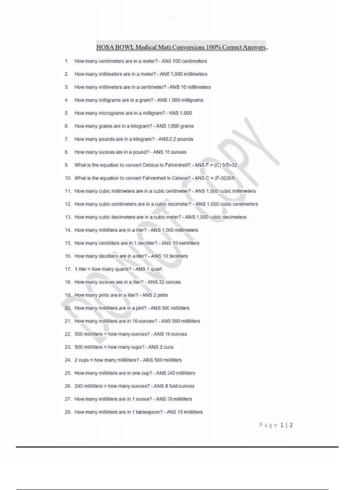 HOSA BOWL Medical Math Conversions 100% Correct Answers.