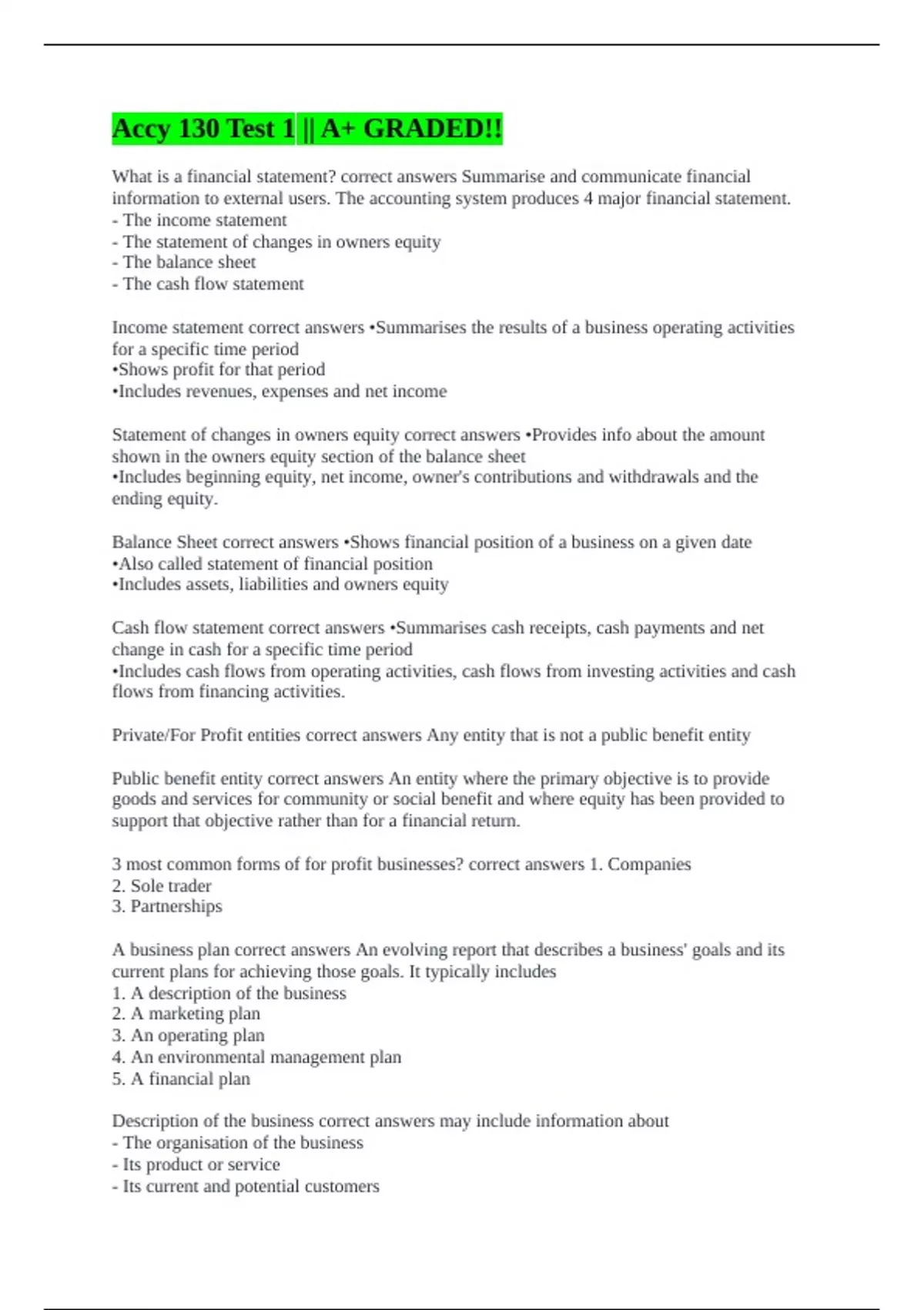 Balance Sheet correct answers •Shows financial position of a business on a given date