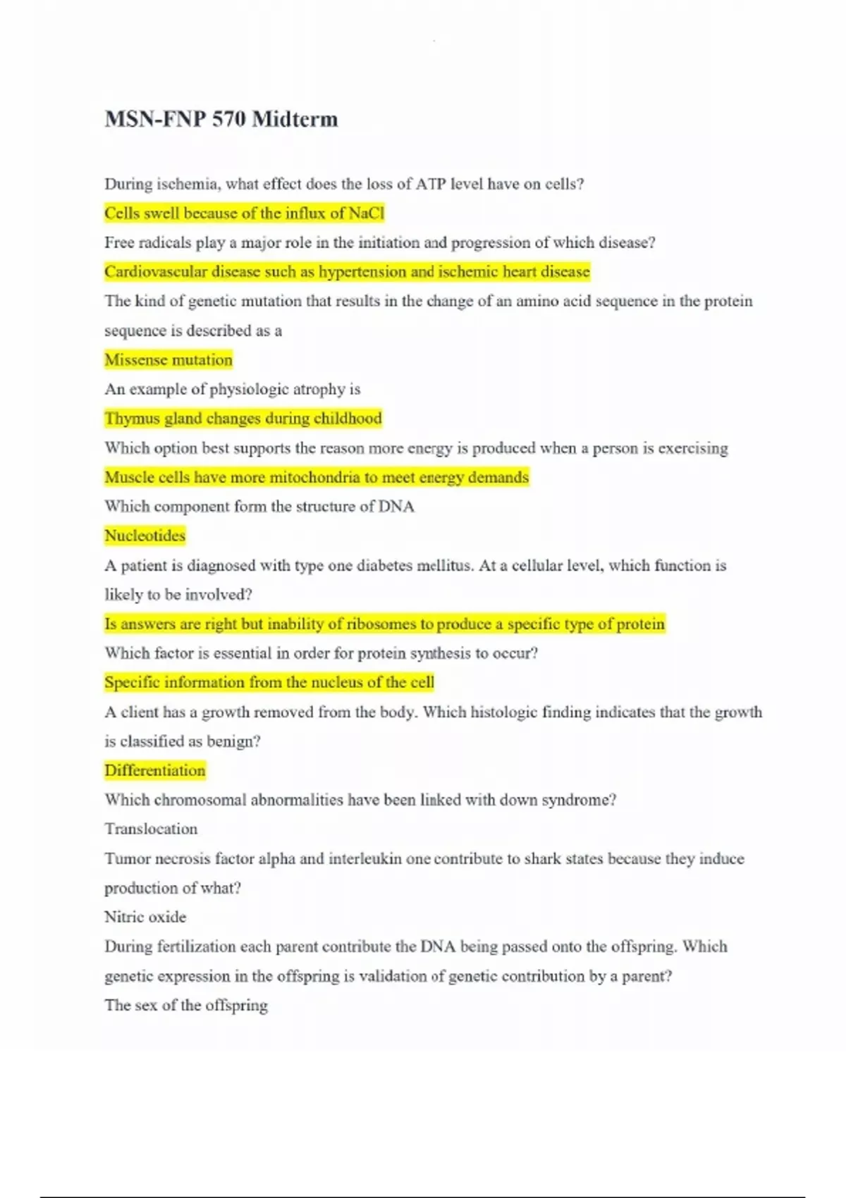 MSN-FNP 570 Midterm During ischemia, what effect does the loss of ATP level have on cells? Cells swell because of the influx of NaCl Free radicals play a major role in the initiation and progression of which disease? Cardiovascular disease such as hypertension and ischemic heart disease The kind of genetic mutation that results in the change of an amino acid sequence in the protein sequence is described as a Missense mutation An example of physiologic atrophy is Thymus gland changes during childhood Which option best supports the reason more energy is produced when a person is exercising Muscle cells have more mitochondria to meet energy demands Which component form the structure of DNA Nucleotides A patient is diagnosed with type one diabetes mellitus. At a cellular level, which function is likely to be involved? Is answers are right but inability of ribosomes to produce a specific type of protein Which factor is essential in order for protein synthesis to occur? Specific information from the nucleus of the cell
