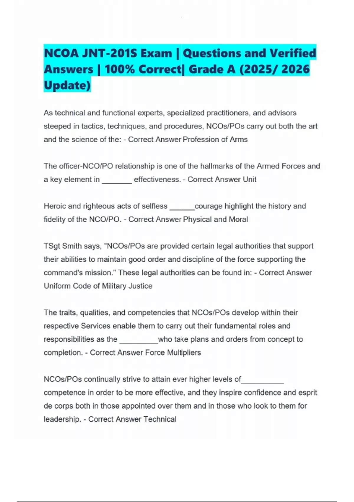 NCOA JNT-201S Exam | Questions and Verified Answers | 100% Correct| Grade A (2025/ 2026 Update) As technical and functional experts, specialized practitioners, and advisors steeped in tactics, techniques, and procedures, NCOs/POs carry out both the art and the science of the: - Correct Answer Profession of Arms The officer-NCO/PO relationship is one of the hallmarks of the Armed Forces and a key element in _______ effectiveness. - Correct Answer Unit Heroic and righteous acts of selfless ______courage highlight the history and fidelity of the NCO/PO. - Correct Answer Physical and Moral TSgt Smith says, "NCOs/POs are provided certain legal authorities that support their abilities to maintain good order and discipline of the force supporting the command's mission." These legal authorities can be found in: - Correct Answer Uniform Code of Military Justice The traits, qualities, and competencies that NCOs/POs develop within their respective Services enable them to carry out their fundamental roles and responsibilities as the _________who take plans and orders from concept to completion. - Correct Answer Force Multipliers NCOs/POs continually strive to attain ever higher levels of__________ competence in order to be more effective, and they inspire confidence and esprit de corps both in those appointed over them and in those who look to them for leadership. - Correct Answer Technical Honor, Respect, and Devotion to Duty are the core values of which of the following Services? - Correct Answer Coast Guard Agility, Innovation, and Boldness are the core values of which