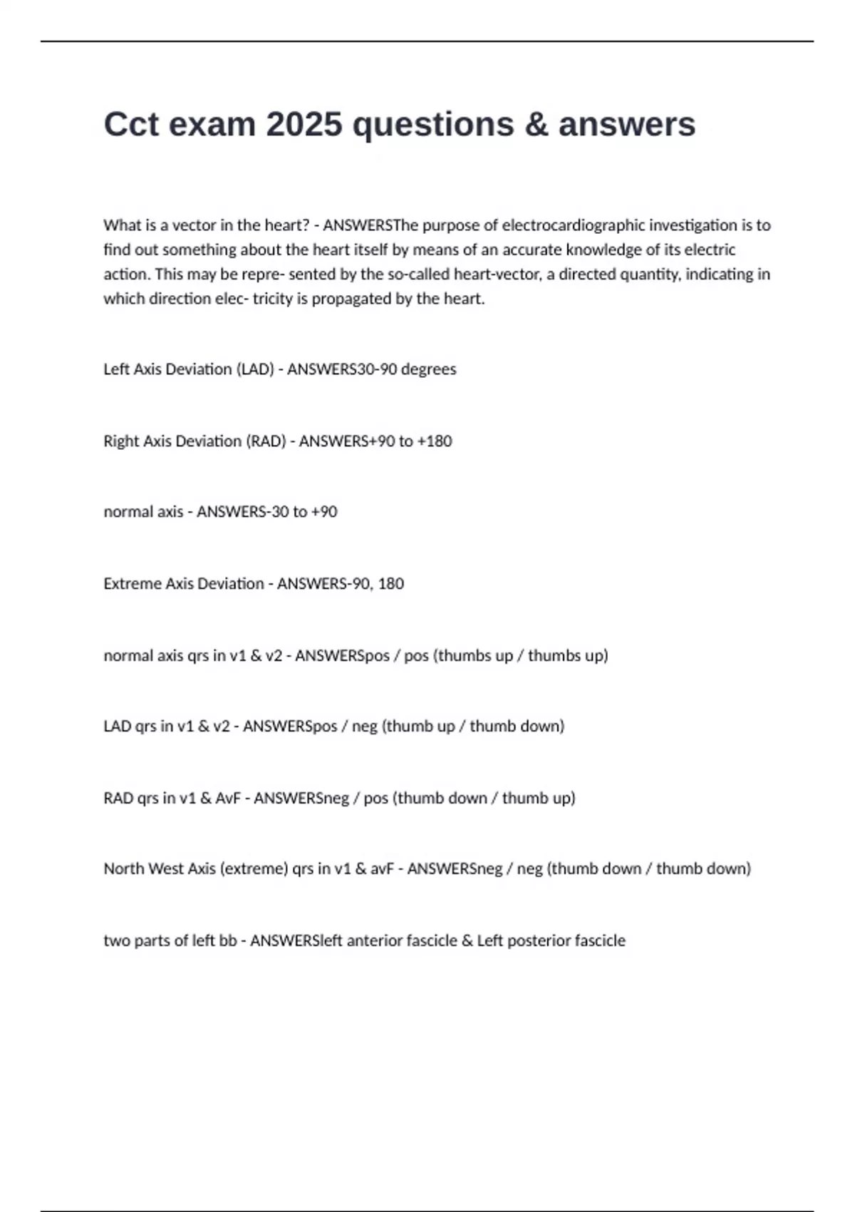 Cct exam 2025 questions & answers What is a vector in the heart? - ANSWERSThe purpose of electrocardiographic investigation is to find out something about the heart itself by means of an accurate knowledge of its electric action. This may be repre- sented by the so-called heart-vector, a directed quantity, indicating in which direction elec- tricity is propagated by the heart. Left Axis Deviation (LAD) - ANSWERS30-90 degrees Right Axis Deviation (RAD) - ANSWERS+90 to +180 normal axis - ANSWERS-30 to +90 Extreme Axis Deviation - ANSWERS-90, 180 normal axis qrs in v1 & v2 - ANSWERSpos / pos (thumbs up / thumbs up) LAD qrs in v1 & v2 - ANSWERSpos / neg (thumb up / thumb down) RAD qrs in v1 & AvF - ANSWERSneg / pos (thumb down / thumb up) North West Axis (extreme) qrs in v1 & avF - ANSWERSneg / neg (thumb down / thumb down) two parts of left bb - ANSWERSleft anterior fascicle & Left posterior fascicle