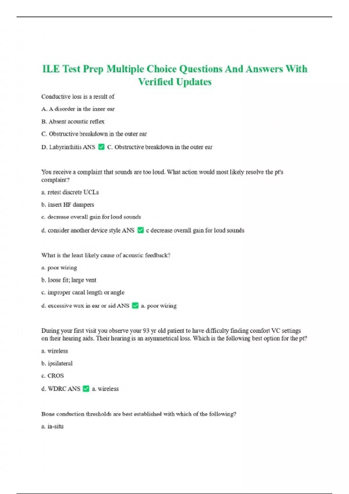 ILE Test Prep Multiple Choice Questions And Answers With Verified Updates Conductive loss is a result of A. A disorder in the inner ear B. Absent acoustic reflex C. Obstructive breakdown in the outer ear D. Labyrinthitis ANS C. Obstructive breakdown in the outer ear You receive a complaint that sounds are too loud. What action would most likely resolve the pt's complaint? a. retest discrete UCLs b. insert HF dampers c. decrease overall gain for loud sounds d. consider another device style ANS c decrease overall gain for loud sounds What is the least likely cause of acoustic feedback? a. poor wiring b. loose fit; large vent c. improper canal length or angle d. excessive wax in ear or aid ANS a. poor wiring During your first visit you observe your 93 yr old patient to have difficulty finding comfort VC settings on their hearing aids. Their hearing is an asymmetrical loss. Which is the following best option for the pt? a. wireless b. ipsilateral c. CROS d. WDRC ANS a. wireless Bone conduction thresholds are best established with which of the following? a. in-situ b. use of HA-2 coupler c. use of Zwislock 2-cc d. B-72 ANS d. B-72 You receive a complaint that sounds are too soft. Which adjustment would resolve pt complaint? a. establishing binaural SRT's b. increase low and mid frequency gain c. engage frequency transposition technology d. decrease HF gain ANS b. increase low and mid frequency gain The reference test position (RTP) is necessary to establish when obtaining which of the following? a. harmonic distortion b. HF average full on gain c. special purpose average d. rise characteristics ANS a. harmonic distortion Which two statements best describe the use of insert phones? a. insert phones are recommended for patients with prolapsed ear canals b. insert phone provide more accurate test reliability c. insert phones extend audiometric test limits d. all of the above ANS a. insert phones are recommended for patients with prolapsed ear canals b. insert phone provide more accurate test reliability Congenital loss results in which shape audiogram? a. noise notch b. cookie bite c. reverse slope d. precipitous slope ANS b. cookie bite When delivering to a first time wearer you are m
