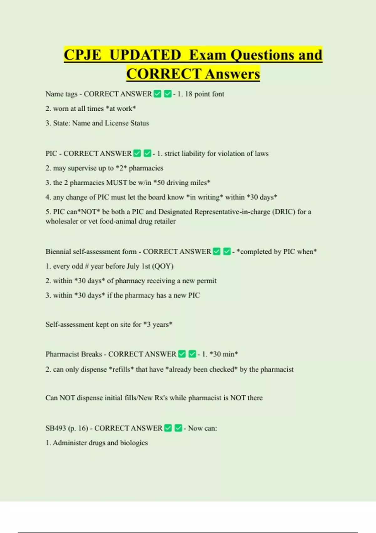 CPJE UPDATED Exam Questions and CORRECT Answers Name tags - CORRECT ANSWER 2. worn at all times *at work* 3. State: Name and License Status PIC - CORRECT ANSWER 2. may supervise up to *2* pharmacies - 1. 18 point font - 1. strict liability for violation of laws 3. the 2 pharmacies MUST be w/in *50 driving miles* 4. any change of PIC must let the board know *in writing* within *30 days* 5. PIC can*NOT* be both a PIC and Designated Representative-in-charge (DRIC) for a wholesaler or vet food-animal drug retailer