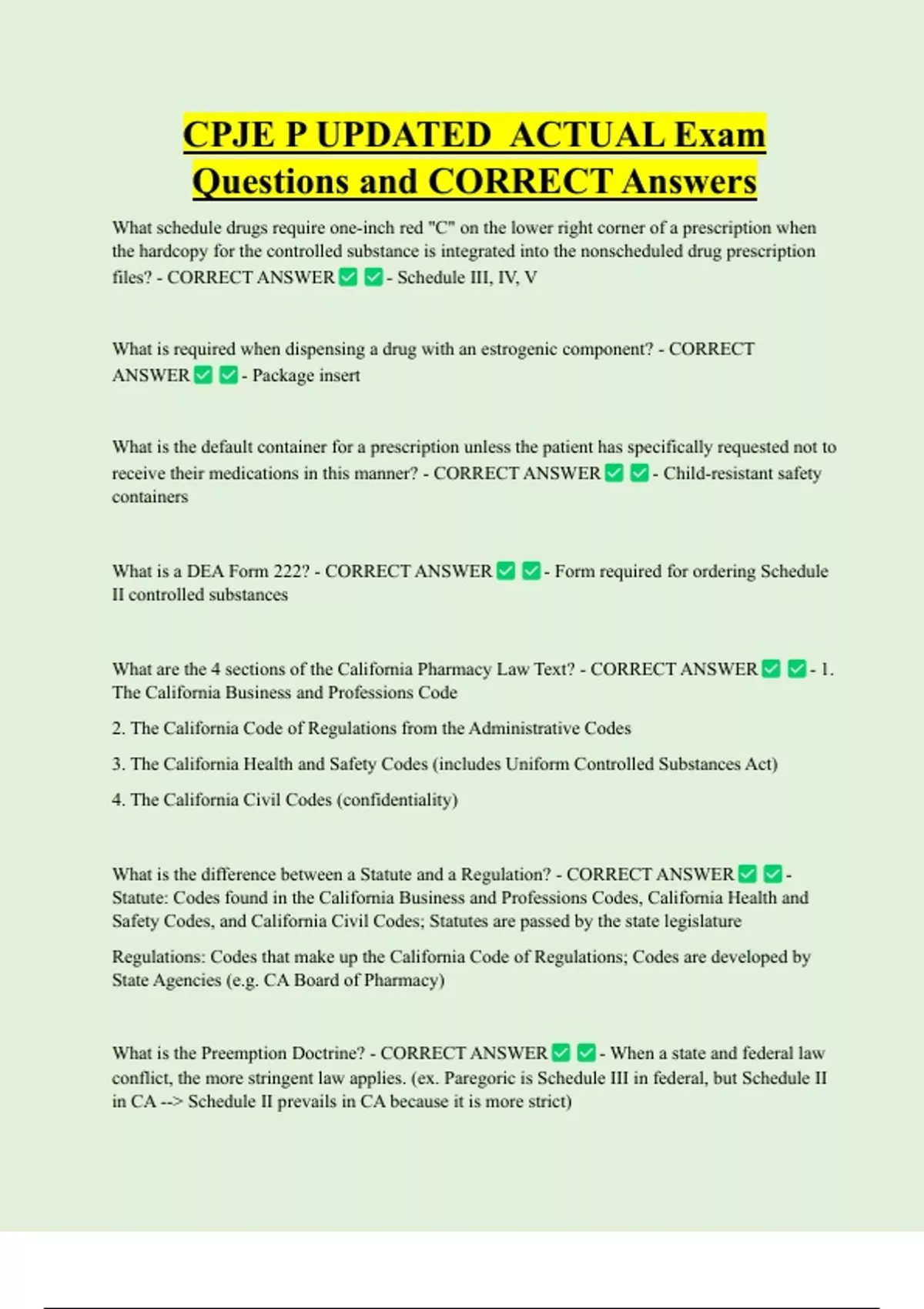 CPJE P UPDATED ACTUAL Exam Questions and CORRECT Answers What schedule drugs require one-inch red "C" on the lower right corner of a prescription when the hardcopy for the controlled substance is integrated into the nonscheduled drug prescription files? - CORRECT ANSWER - Schedule III, IV, V What is required when dispensing a drug with an estrogenic component? - CORRECT ANSWER - Package insert What is the default container for a prescription unless the patient has specifically requested not to receive their medications in this manner? - CORRECT ANSWER - Child-resistant safet