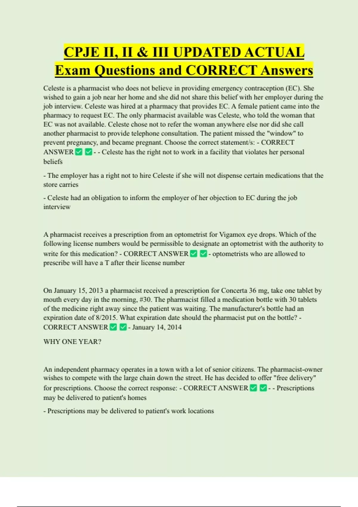 CPJE II, II & III UPDATED ACTUAL Exam Questions and CORRECT Answers Celeste is a pharmacist who does not believe in providing emergency contraception (EC). She wished to gain a job near her home and she did not share this belief with her employer during the job interview. Celeste was hired at a pharmacy that provides EC. A female patient came into the pharmacy to request EC. The only pharmacist available was Celeste, who told the woman that EC was not available. Celeste chose not to refer the woman anywhere else nor did she call another pharmacist to provide telephone consultation. The patient missed the "window" to prevent pregnancy, and became pregnant. Choose the correct statement/s: - CORRECT ANSWER beliefs - - Celeste has the right not to work in a facility that violates her personal - The employer has a right not to hire Celeste if she will not dispense certain medications that the store carries - Celeste had an obligation to inform the employer of her objection to EC during the jo