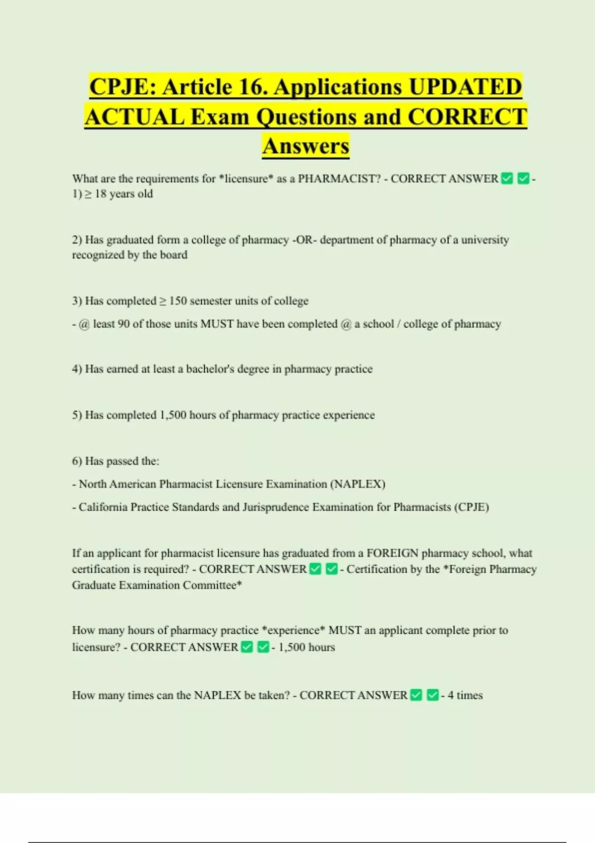CPJE: Article 16. Applications UPDATED ACTUAL Exam Questions and CORRECT Answers What are the requirements for *licensure* as a PHARMACIST? - CORRECT ANSWER 1) ≥ 18 years old 2) Has graduated form a college of pharmacy -OR- department of pharmacy of a university recognized by the board 3) Has completed ≥ 150 semester units of college - @ least 90 of those units MUST have been completed @ a school / college of pharmacy